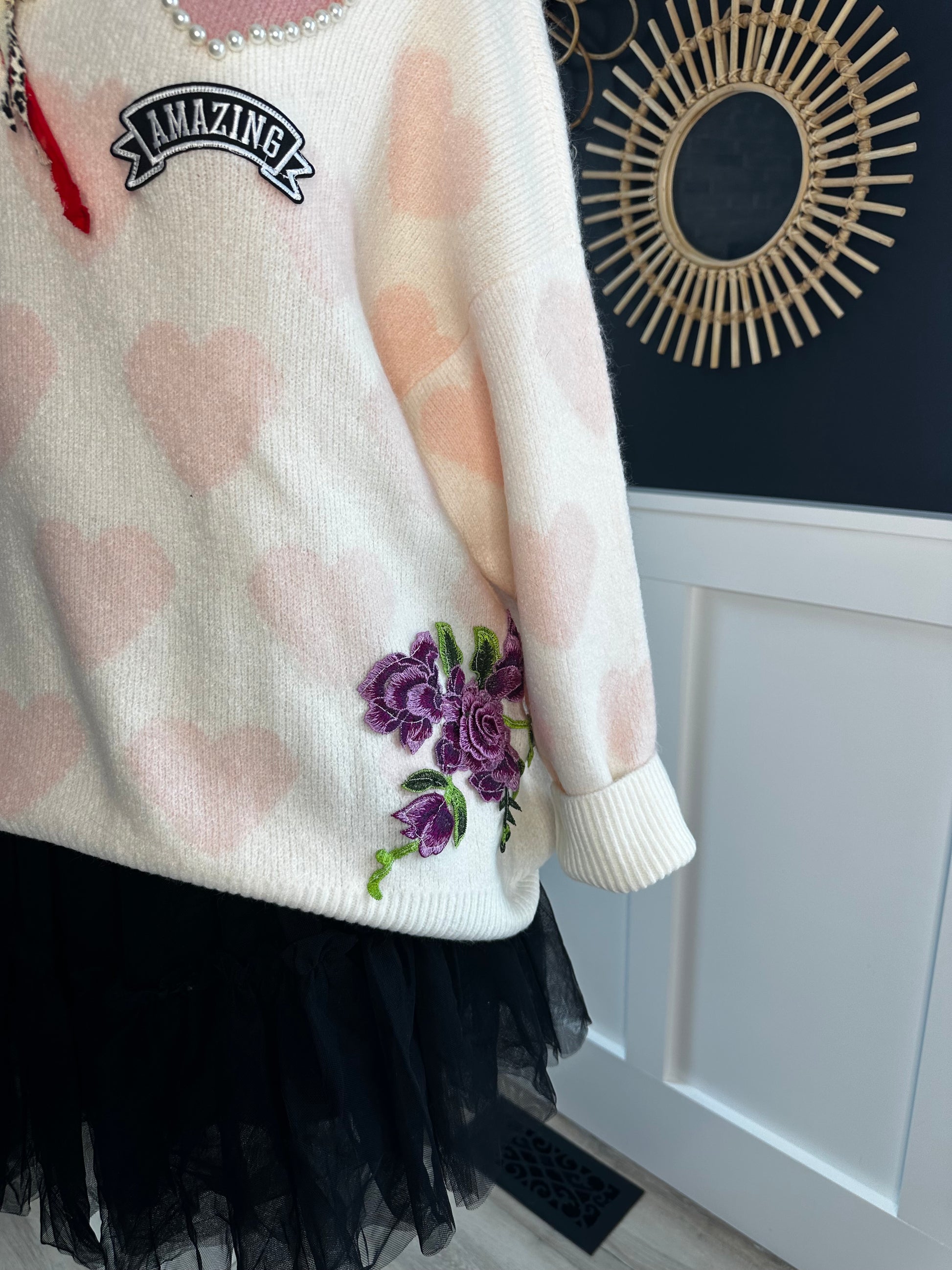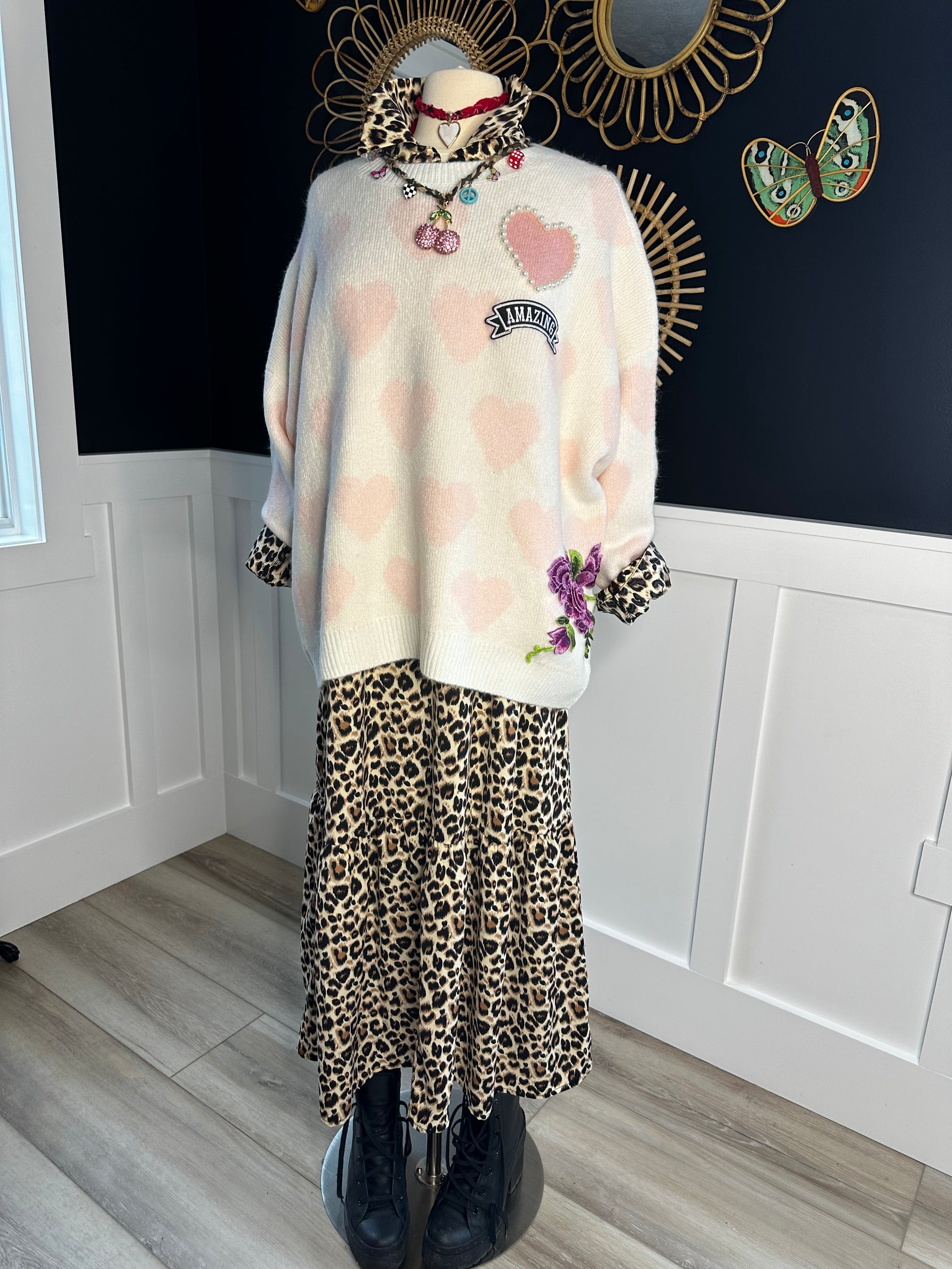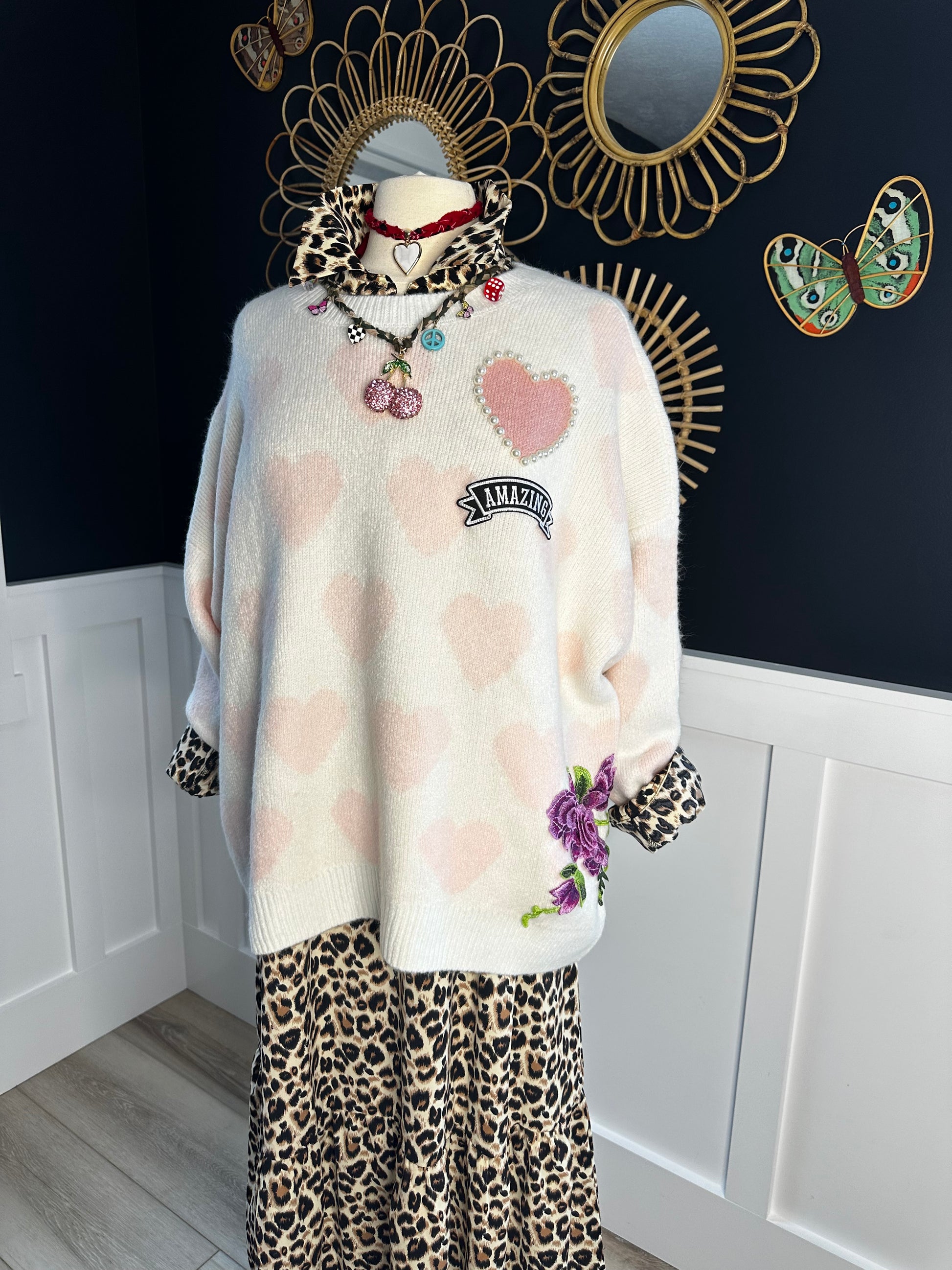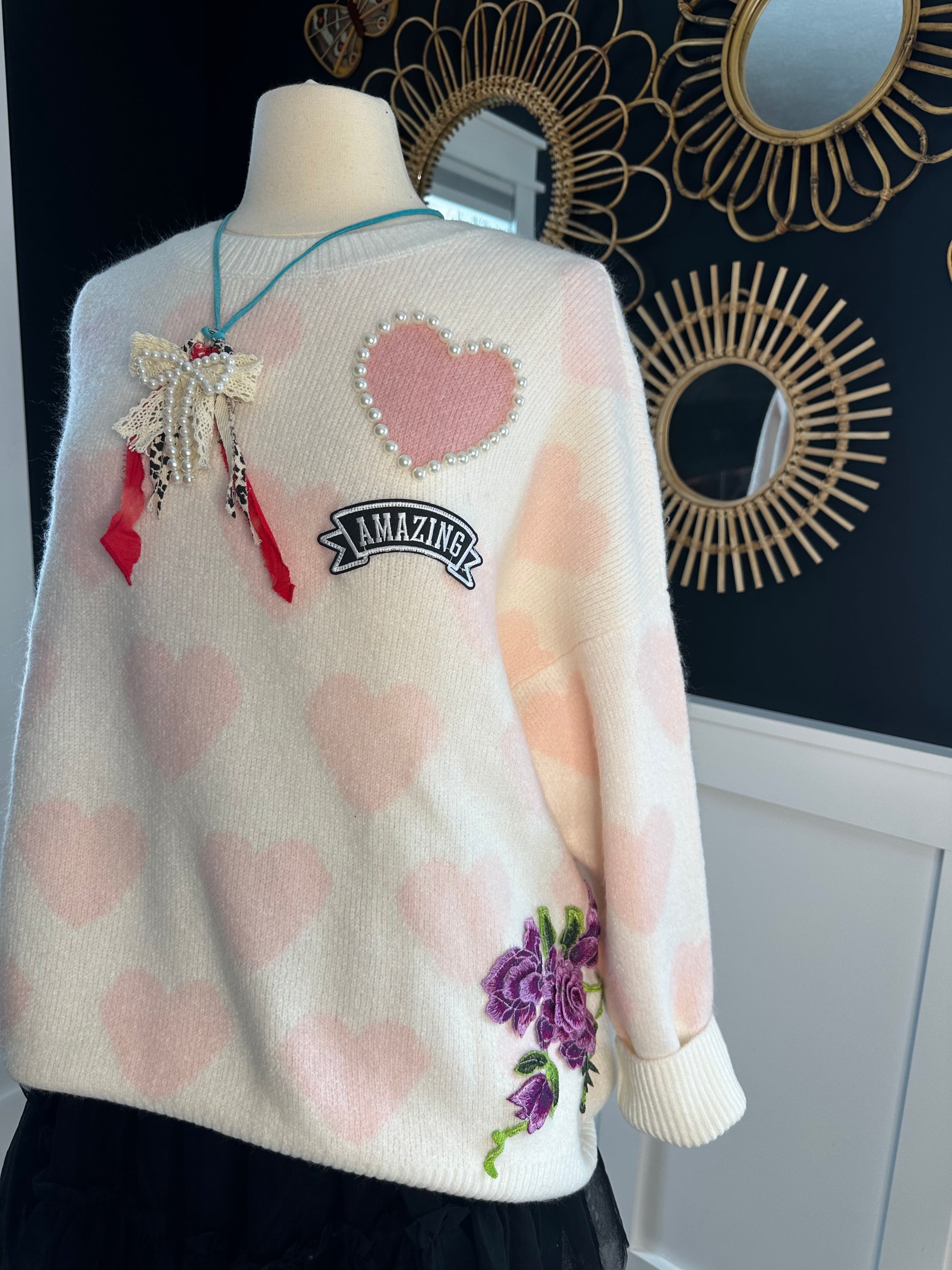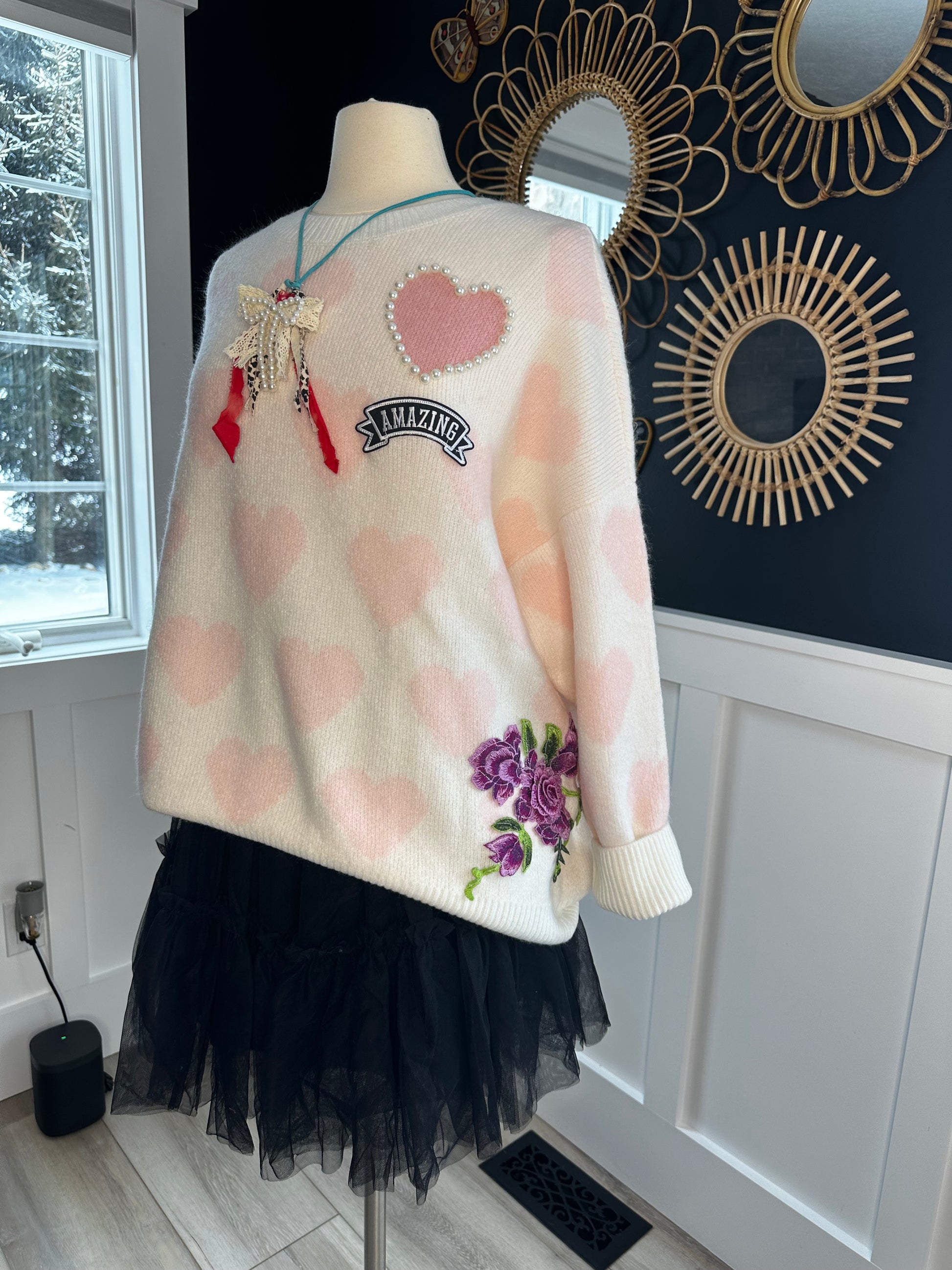 Thereโs a buttery soft Vince Camuto Sweater is perfect for Valentineโs Day, but also has that edgy punk style that would go anytime of the year. This is a boxing style fit and is an XL