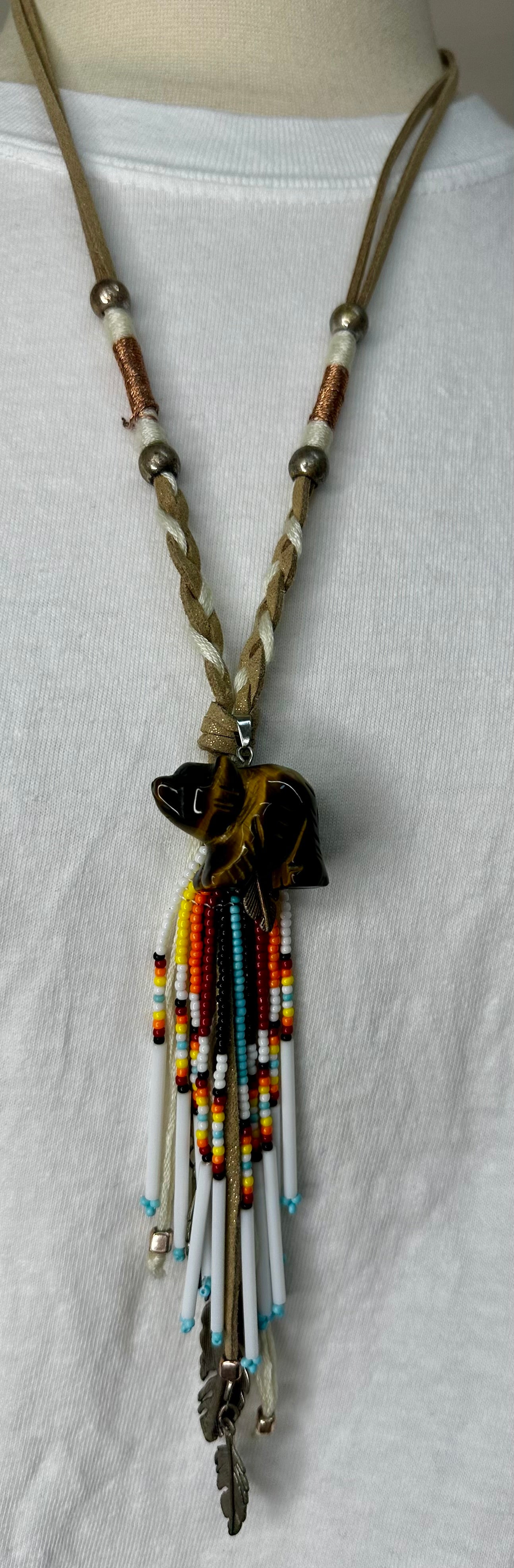 this is such a good one adjustable leather necklace with feathers beads, and the most precious stone bear