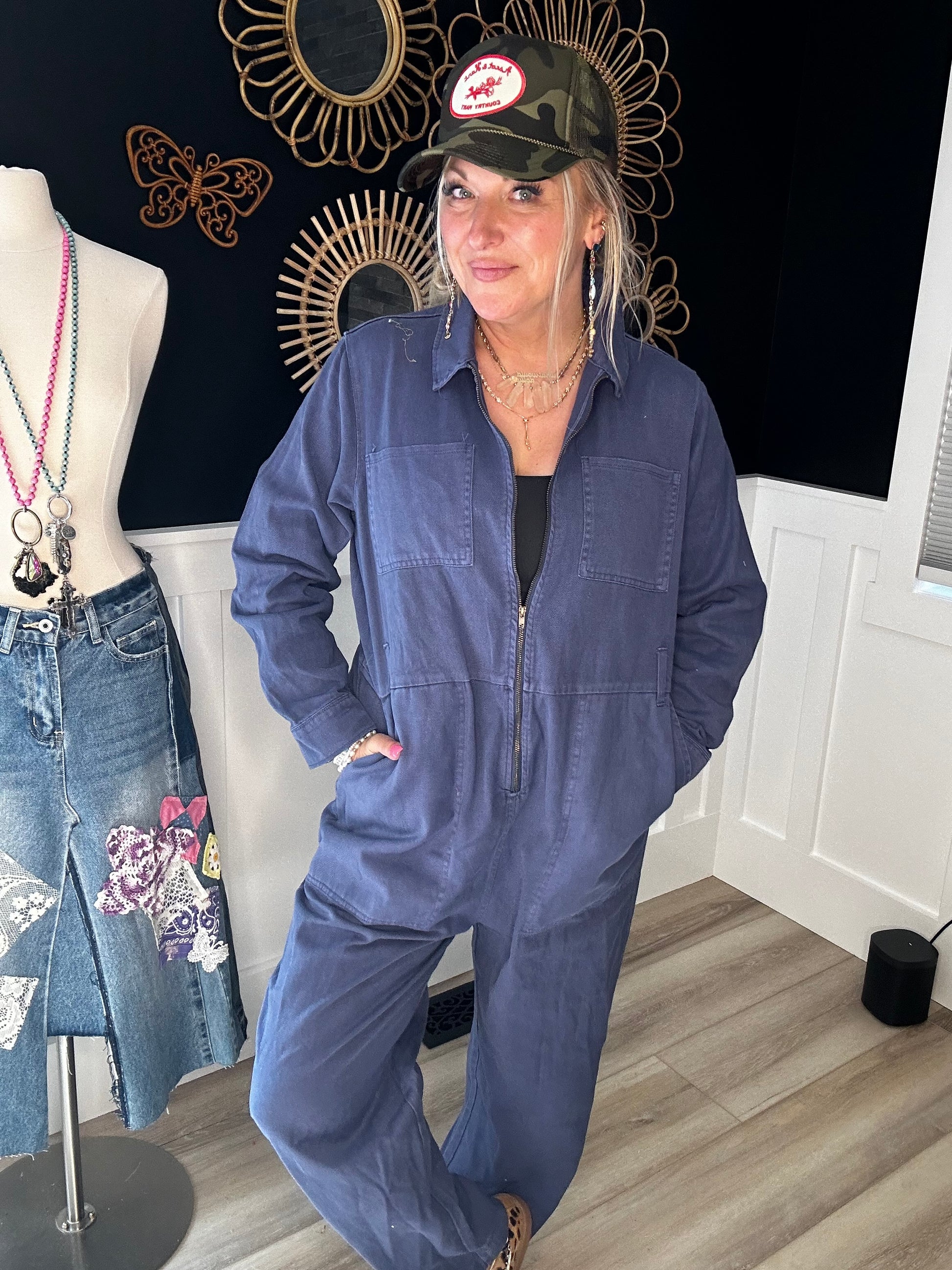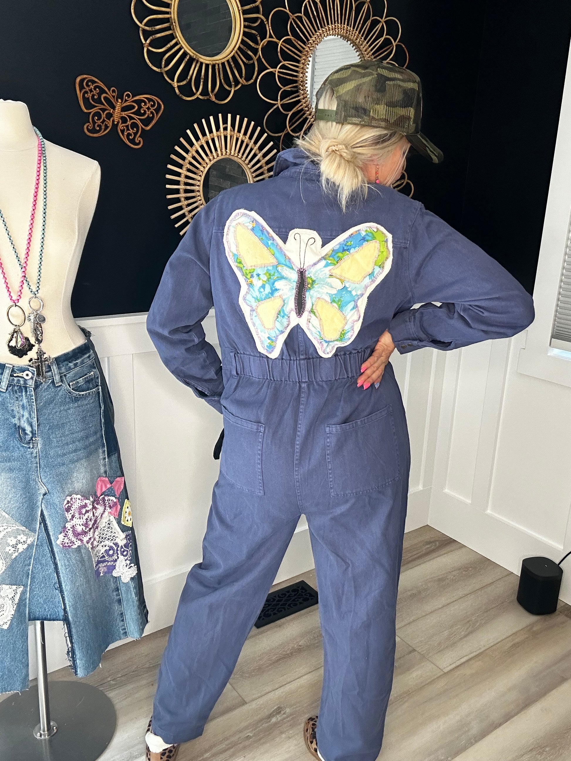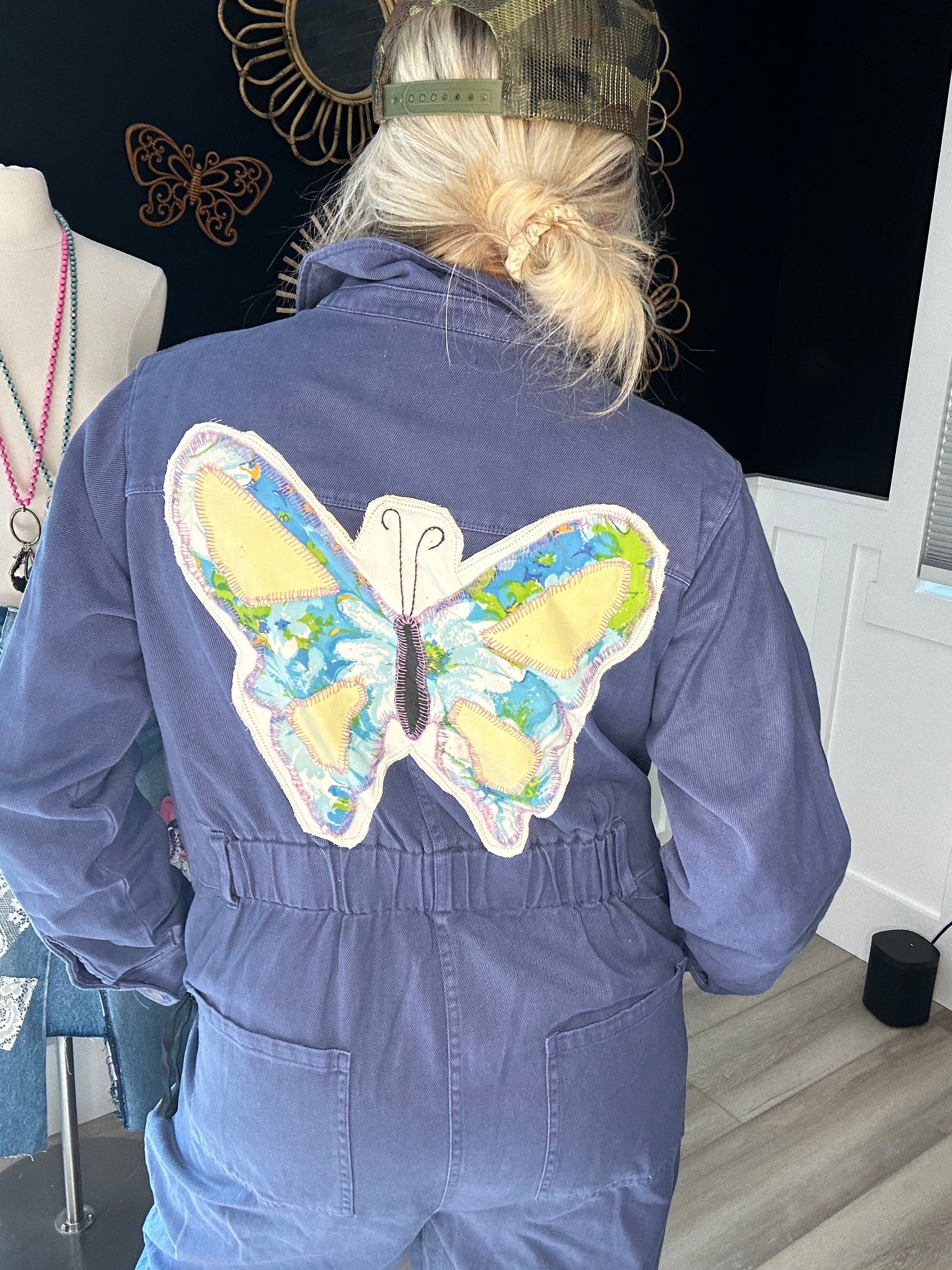This is an ascot and heart boiler suit Is a size large but definitely runs oversized has a beautiful yellow vintage quilt square of a butterfly on the back looks so cute with tennis shoes like in the picture or cowboy boots I can see this cute of it worn so many ways and nothing better than a one piece to make getting dressed, easy and carefree