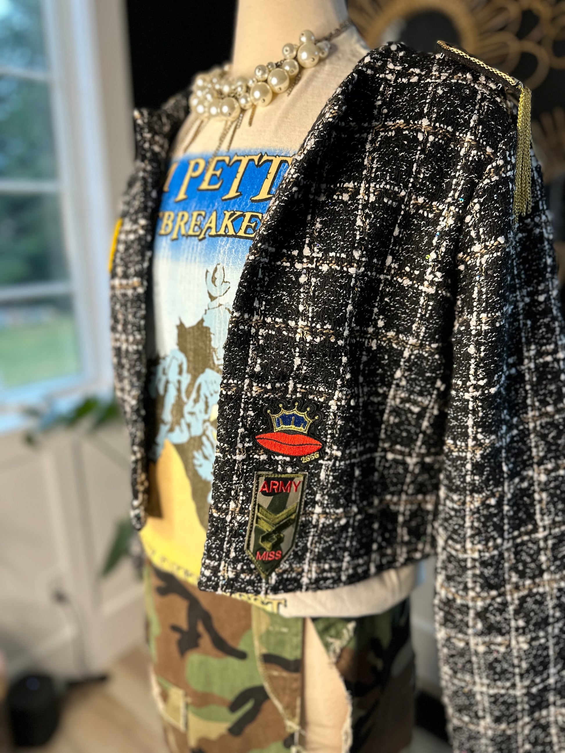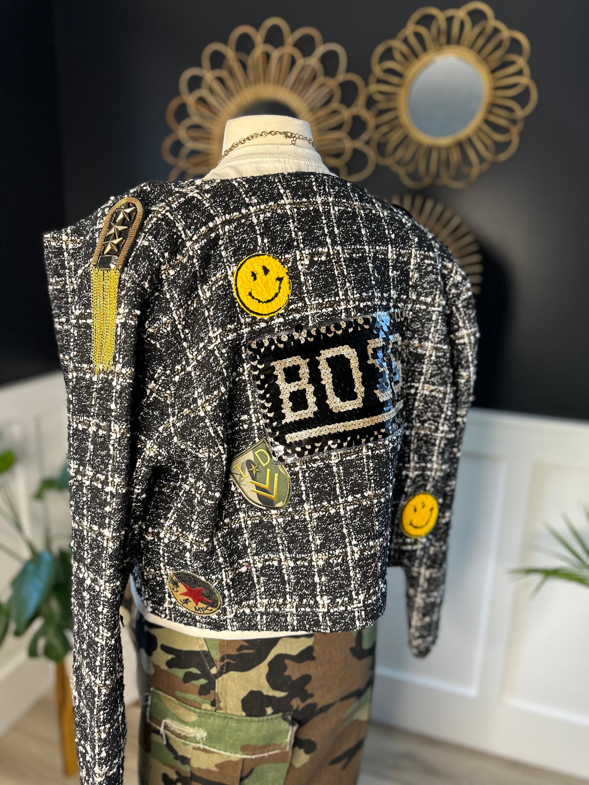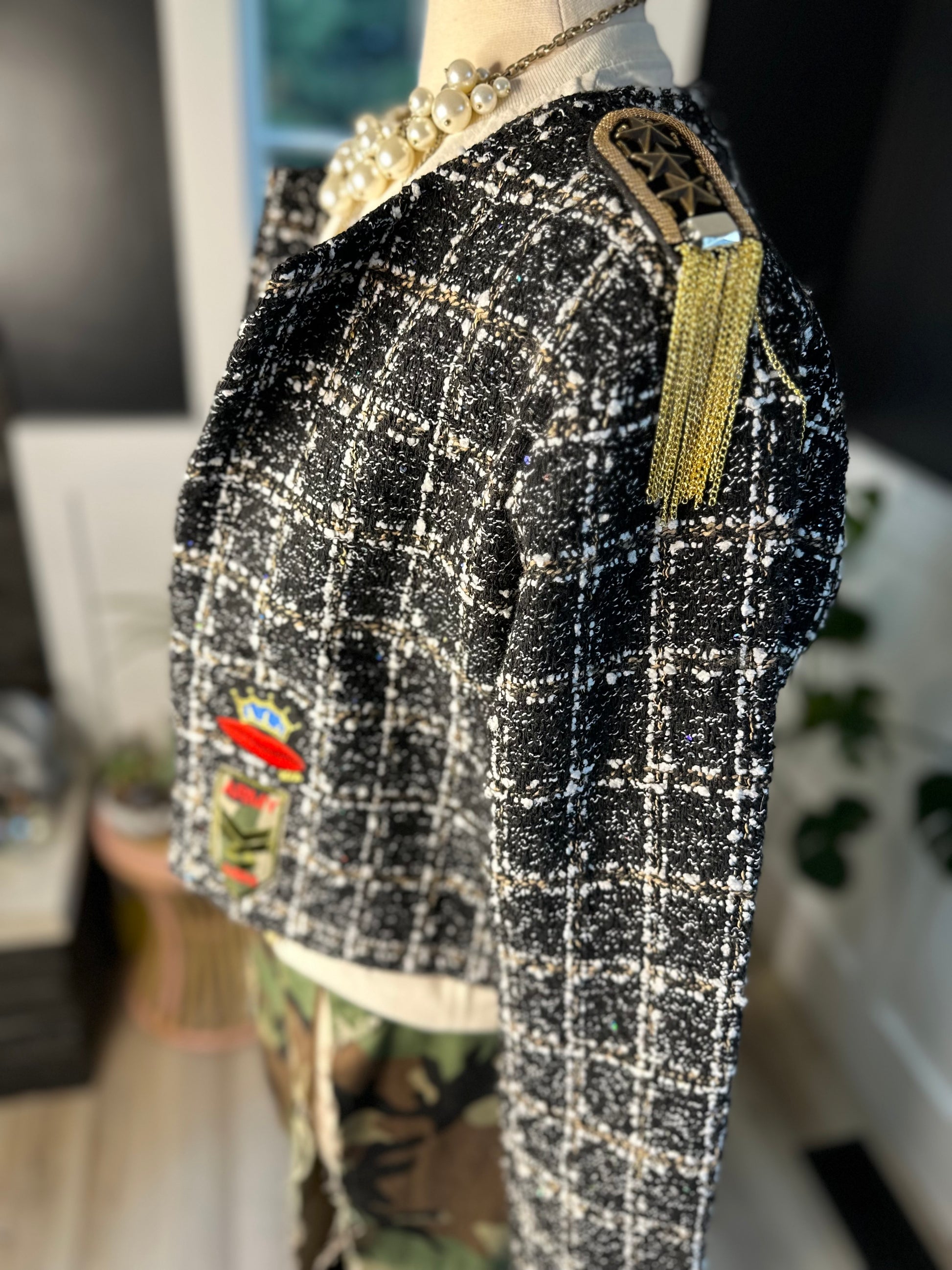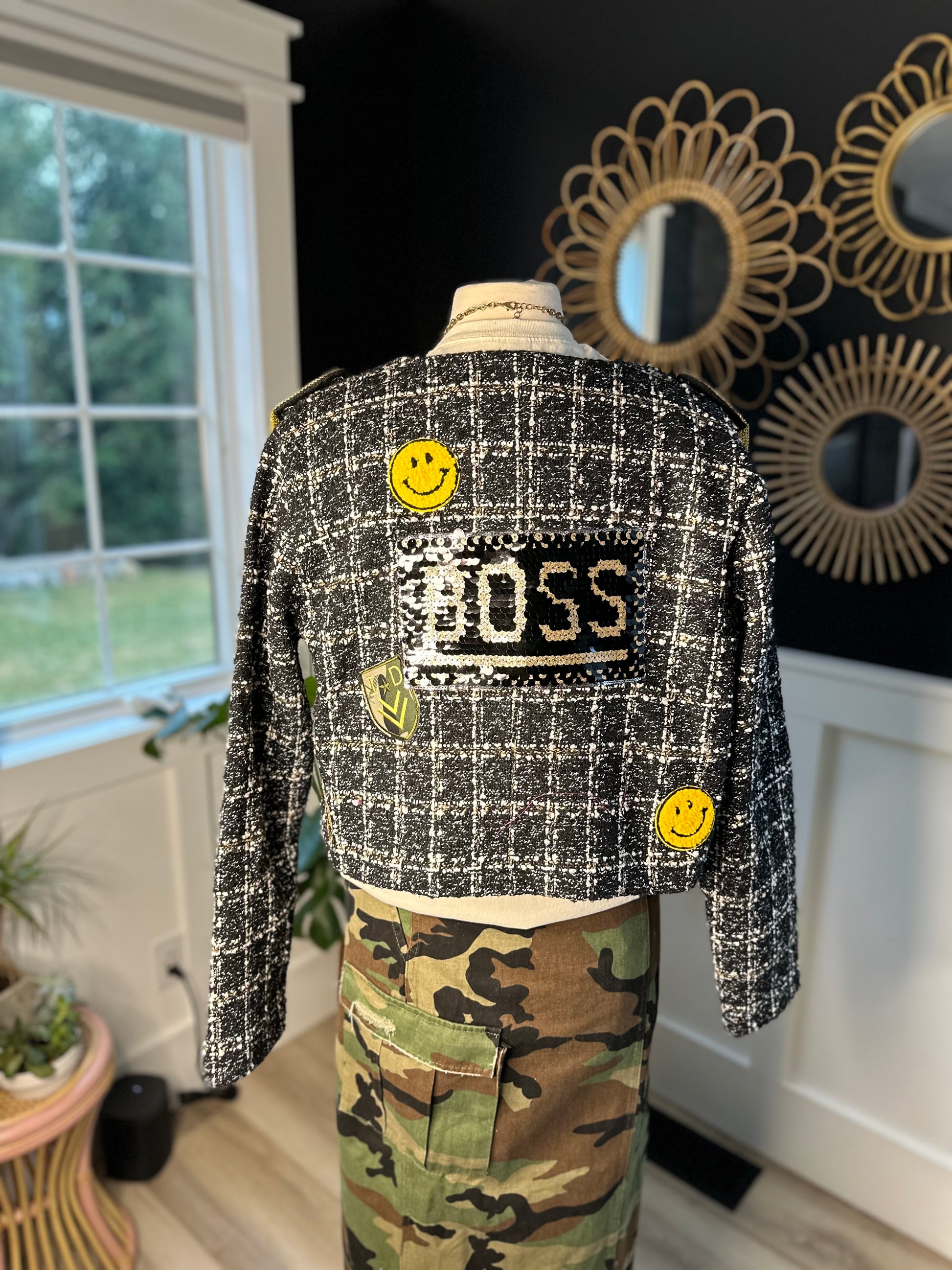 This beautiful, black with whit threading and iridescent, random sequin, boxy blazer size extra large fits, true to size Has a confidence about it all on its own