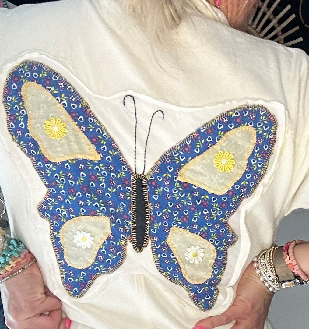 This is the size medium in this photo. Would recommend this for a size small and medium daisy details on the front pockets and vintage blue butterfly quilt square on the back with Daisy details soft and lightweight romper, but not see-through
