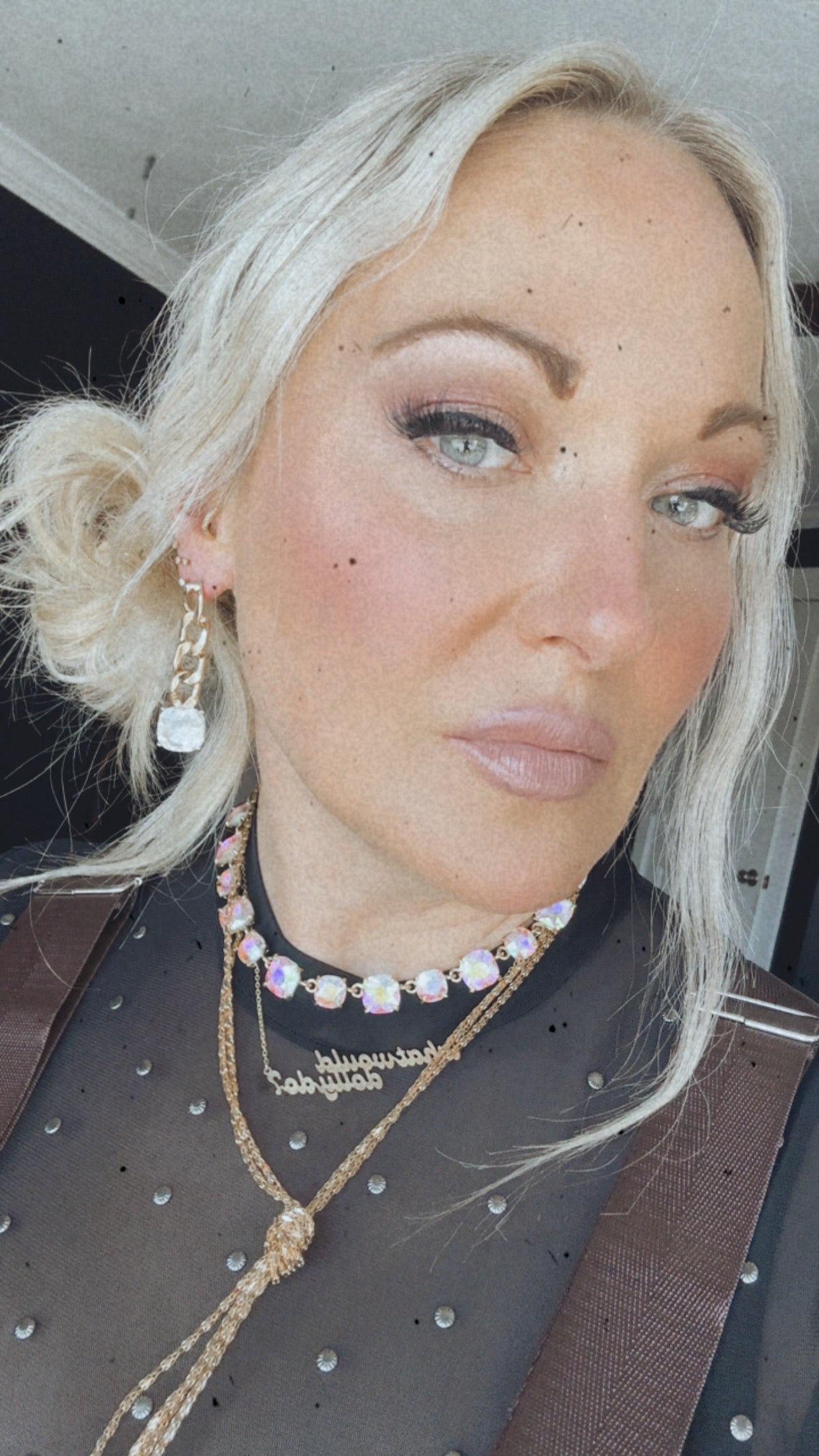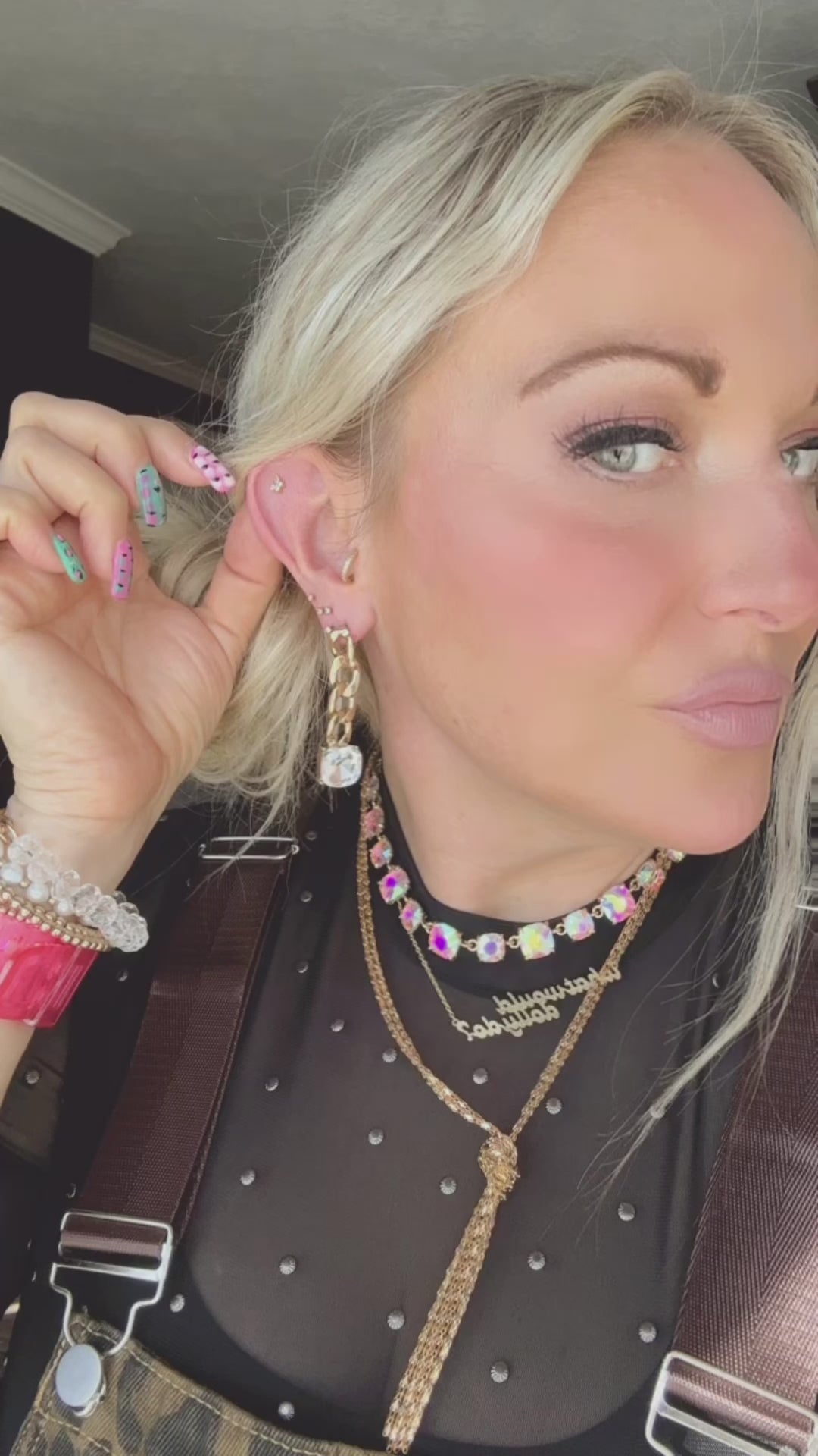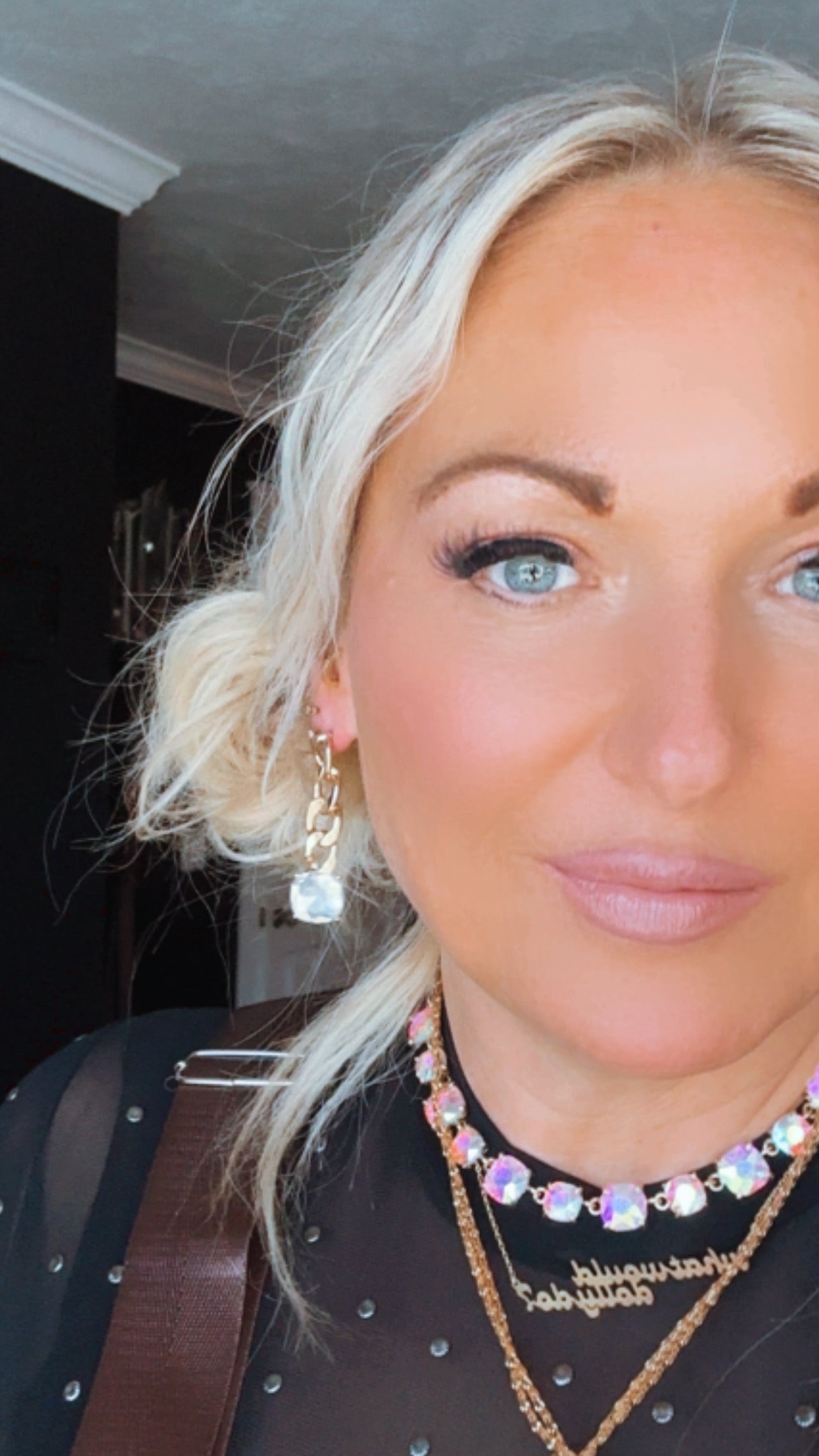 Oversize gold chain with large clear rhinestone as one of my favorite pairs of earrings currently
