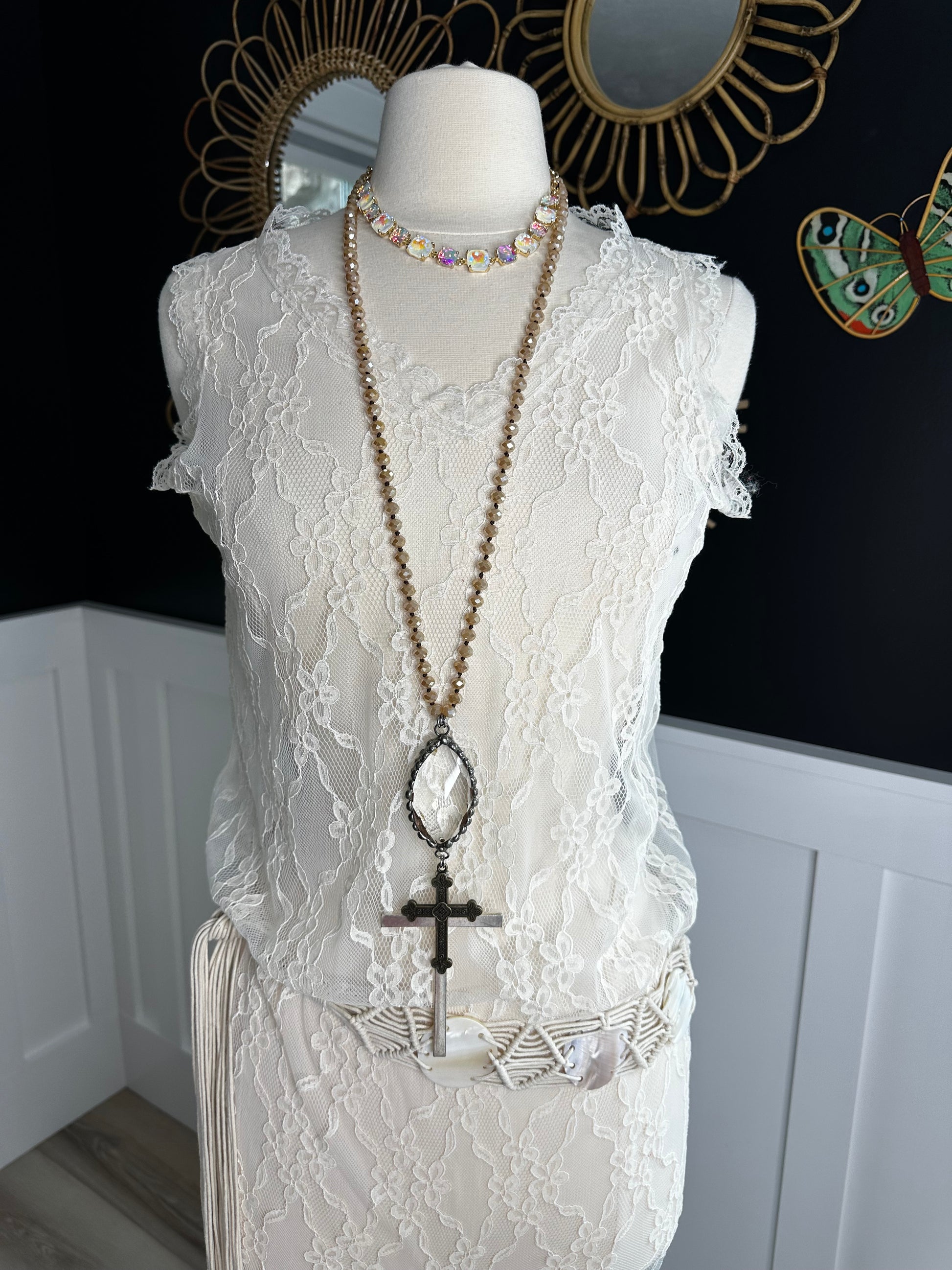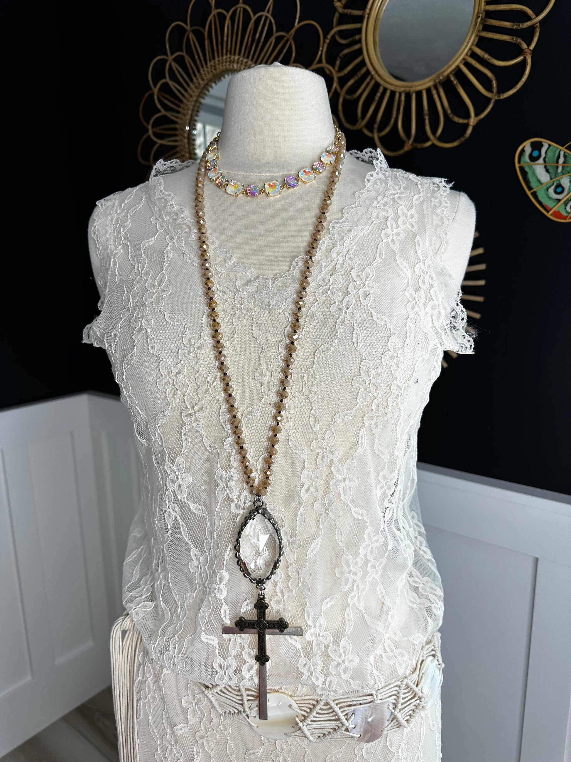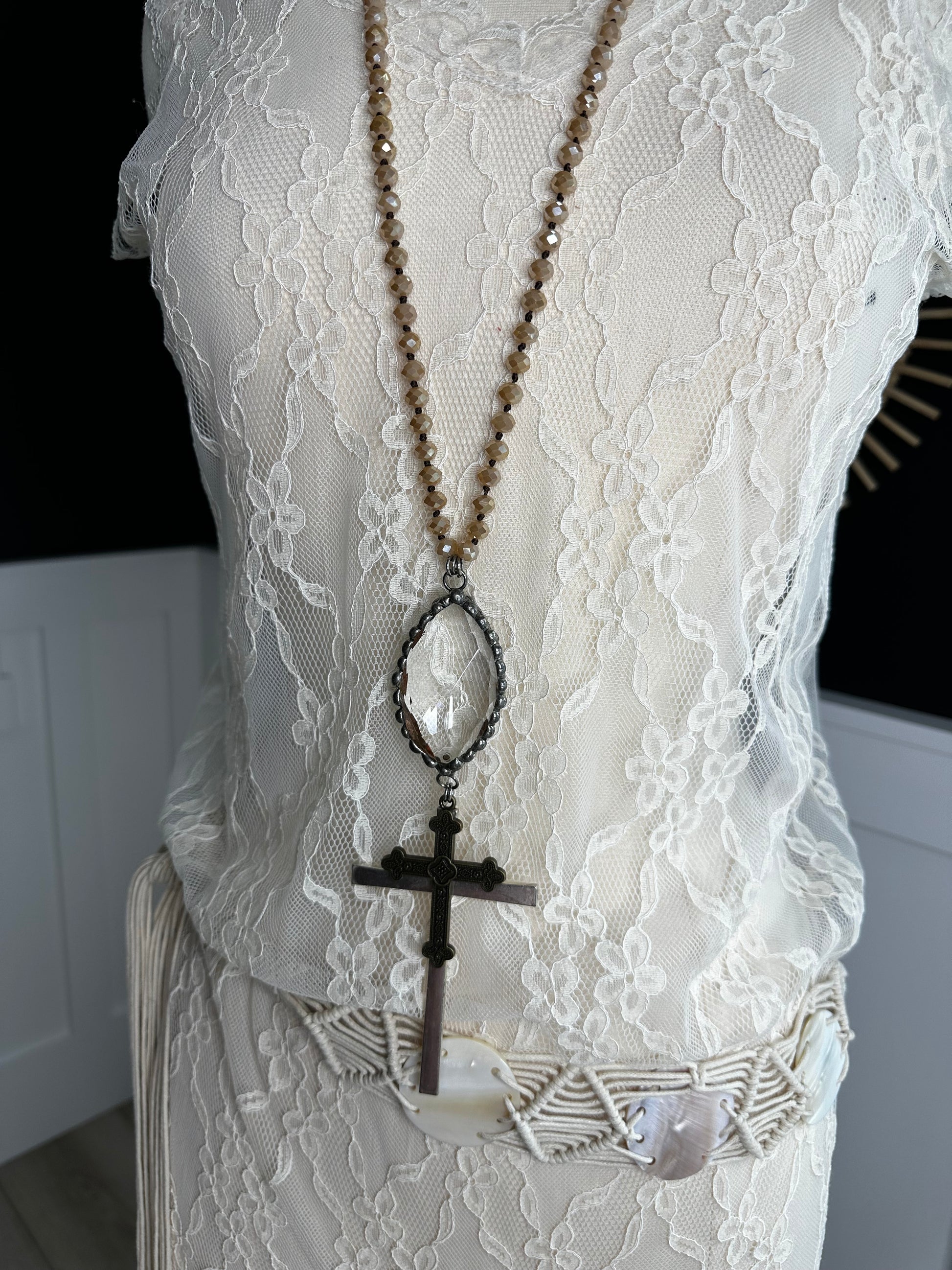 Beautiful center pendant is a chandelier piece soldered with two crosses to make this earth, tone necklace, a statement piece for a long time one of a kind through and through