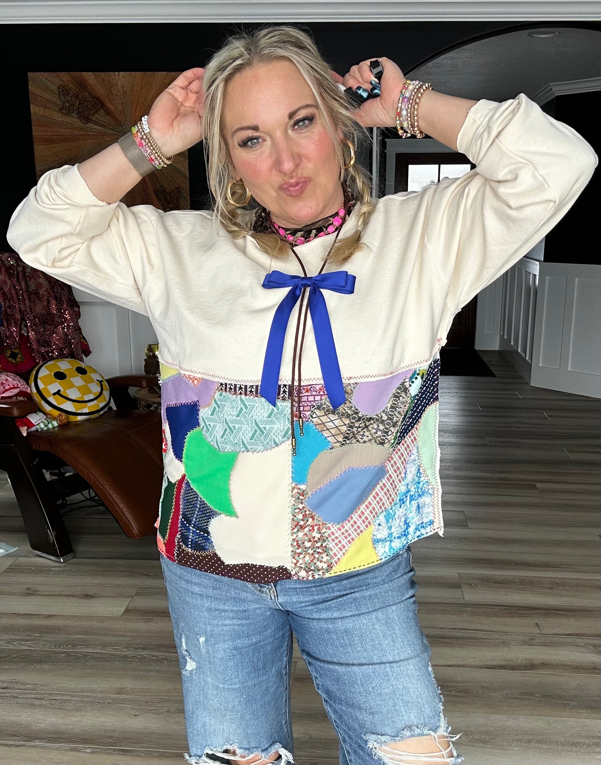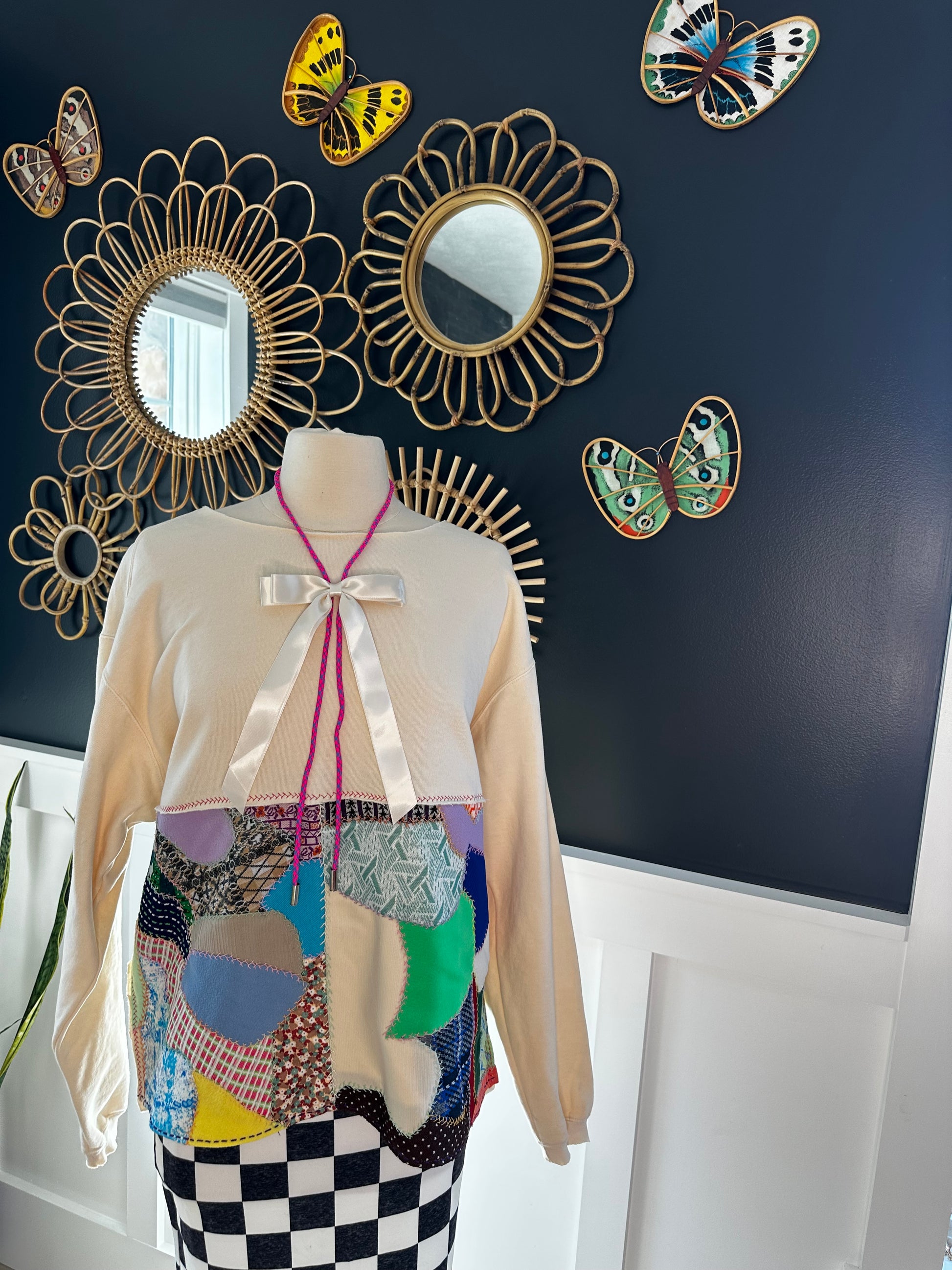 That’s beautiful multicolor crazy quilt pieces are such a fun addition to this cream sweatshirt in the picture. There is multiple different bolos to show how the colors pop with an accessory. Size extra large