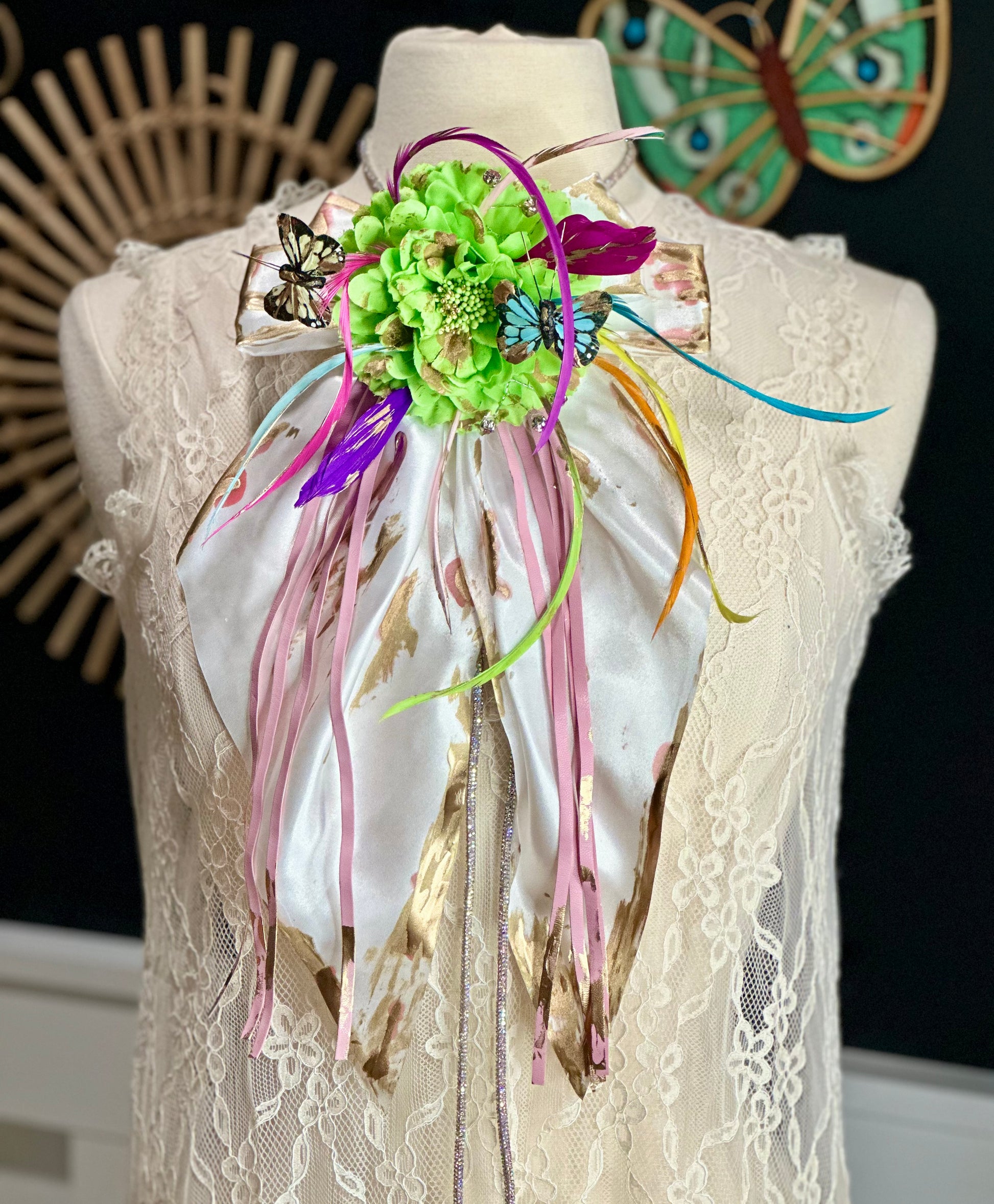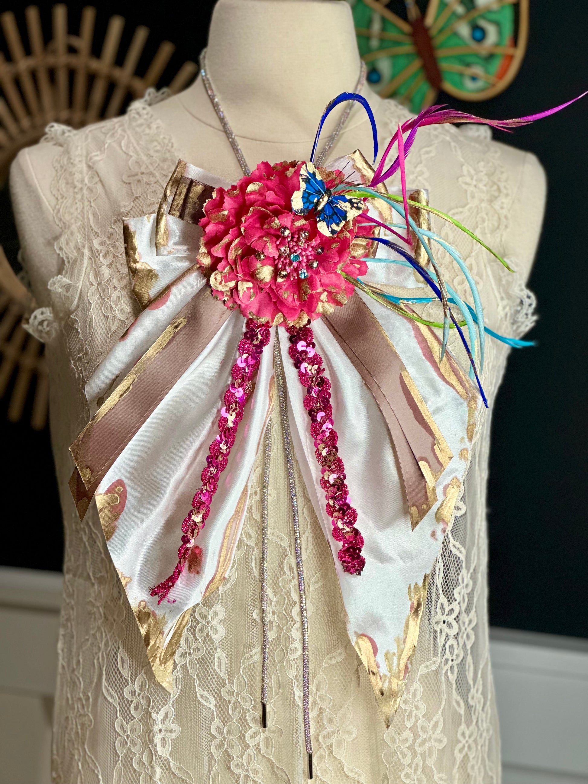 This below is next level with all the detailing it is A showstopper. Each one of these is one of a kind and no one I repeat No one will have one like this all of them have a rhinestone cord, gold leaf affect feathers jewels, butterflies, flowers all the things to make it a spring must have an even better if you get to take it to the racesπ