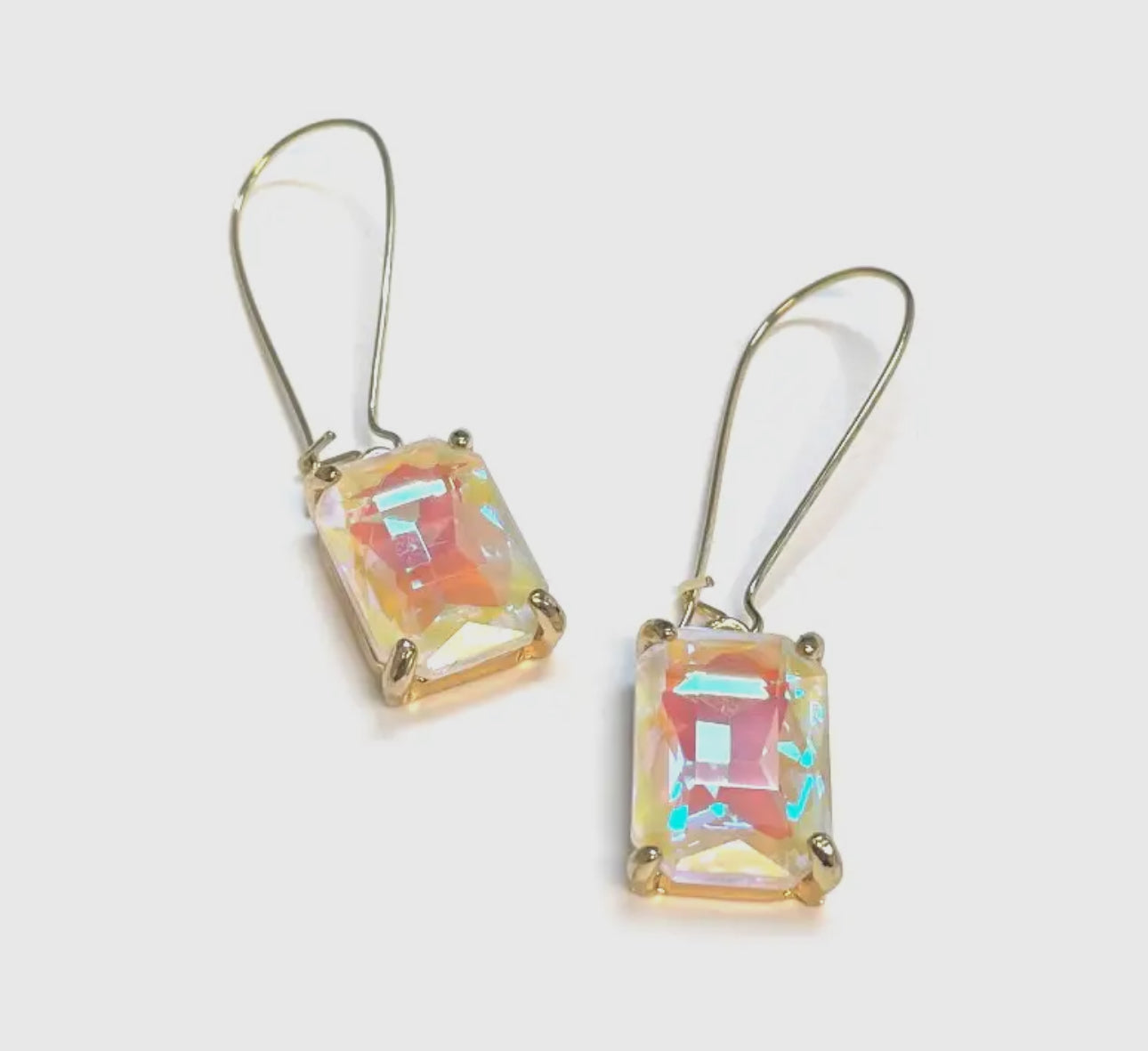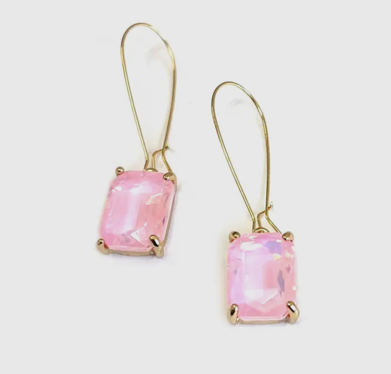 Emerald Cut Glass Wire Dangle Earrings AB, Peach Keen, Baby Pink