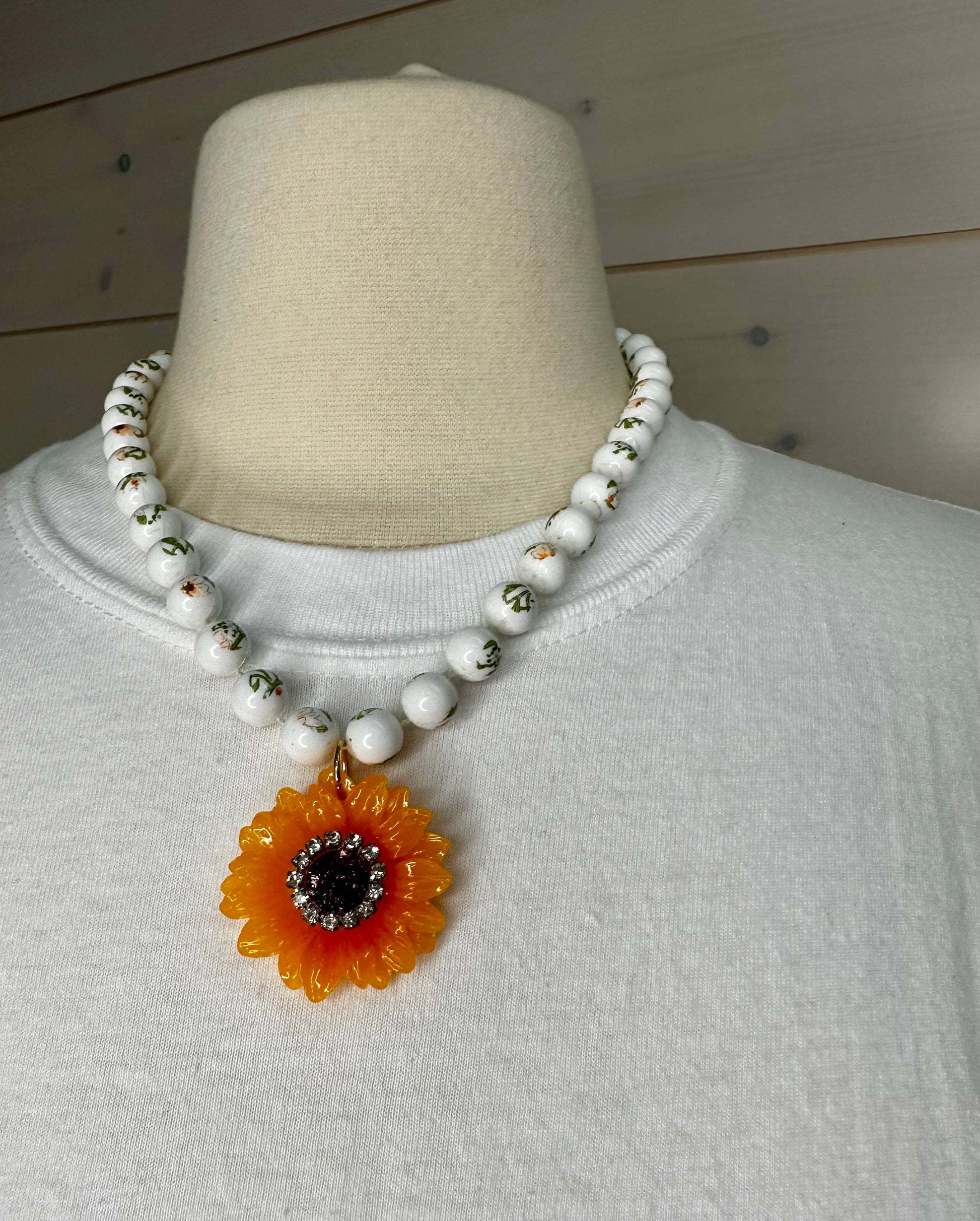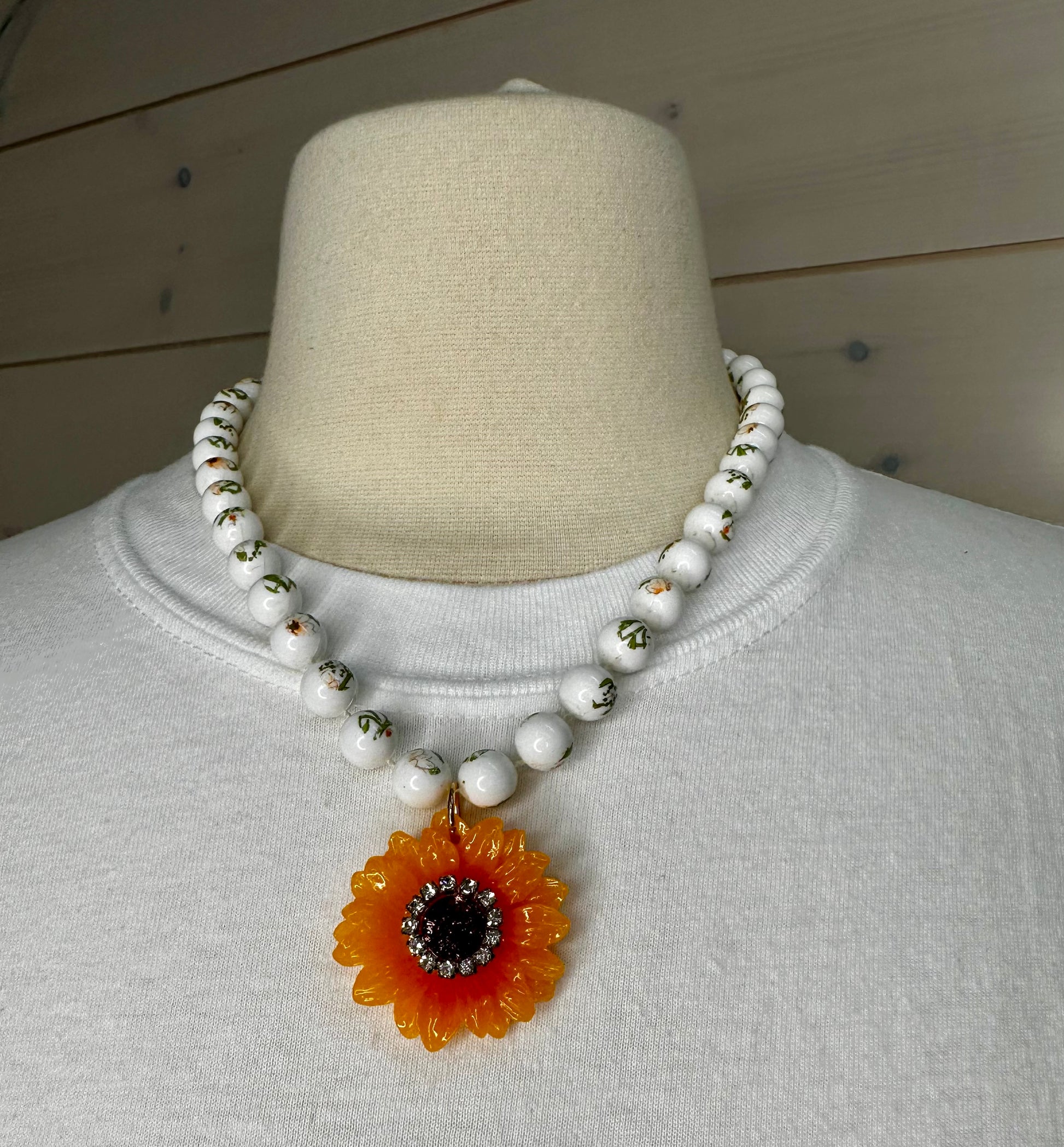 this necklace is so sweet. It’s a vintage white necklace with flowers on the beads and added a rhinestone sunflower for a little extra sparkle.
