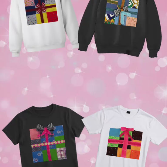 Christmas of many color quilts of cycled presents with all the special details that make them one of a kind and the textures are stunning. You have your choice of sweatshirt or T-shirt and either black Or White