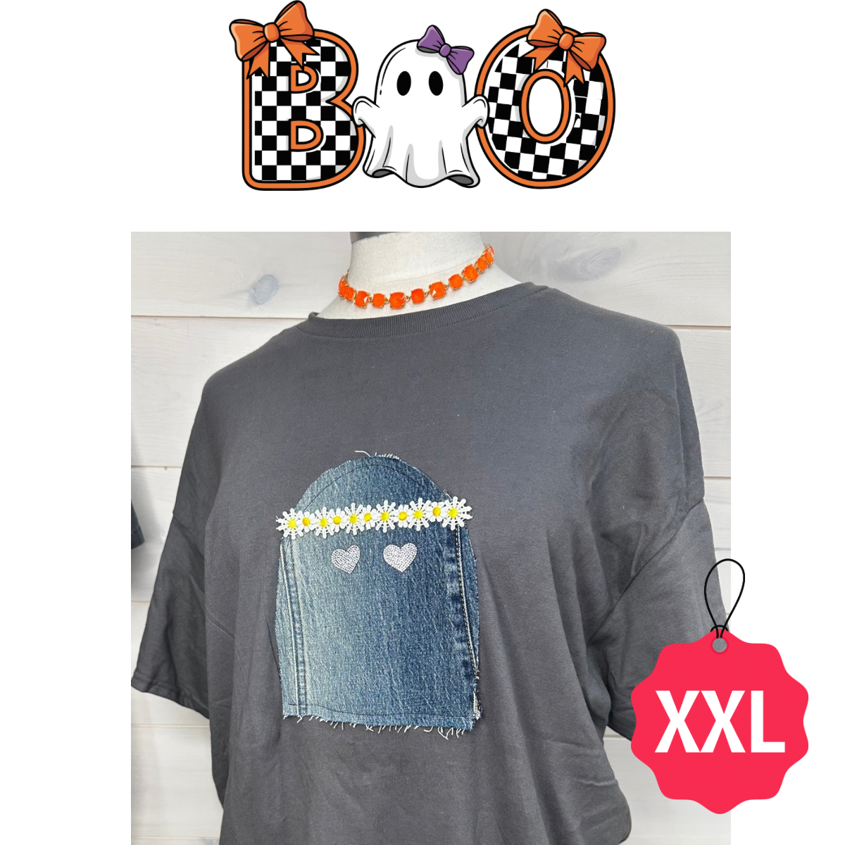 2XL Gilded unisex soft style with the cutest little denim ghost this side in the Mississippi. She has adorable rhinestone eyes and the cutest little flower child Headpiece