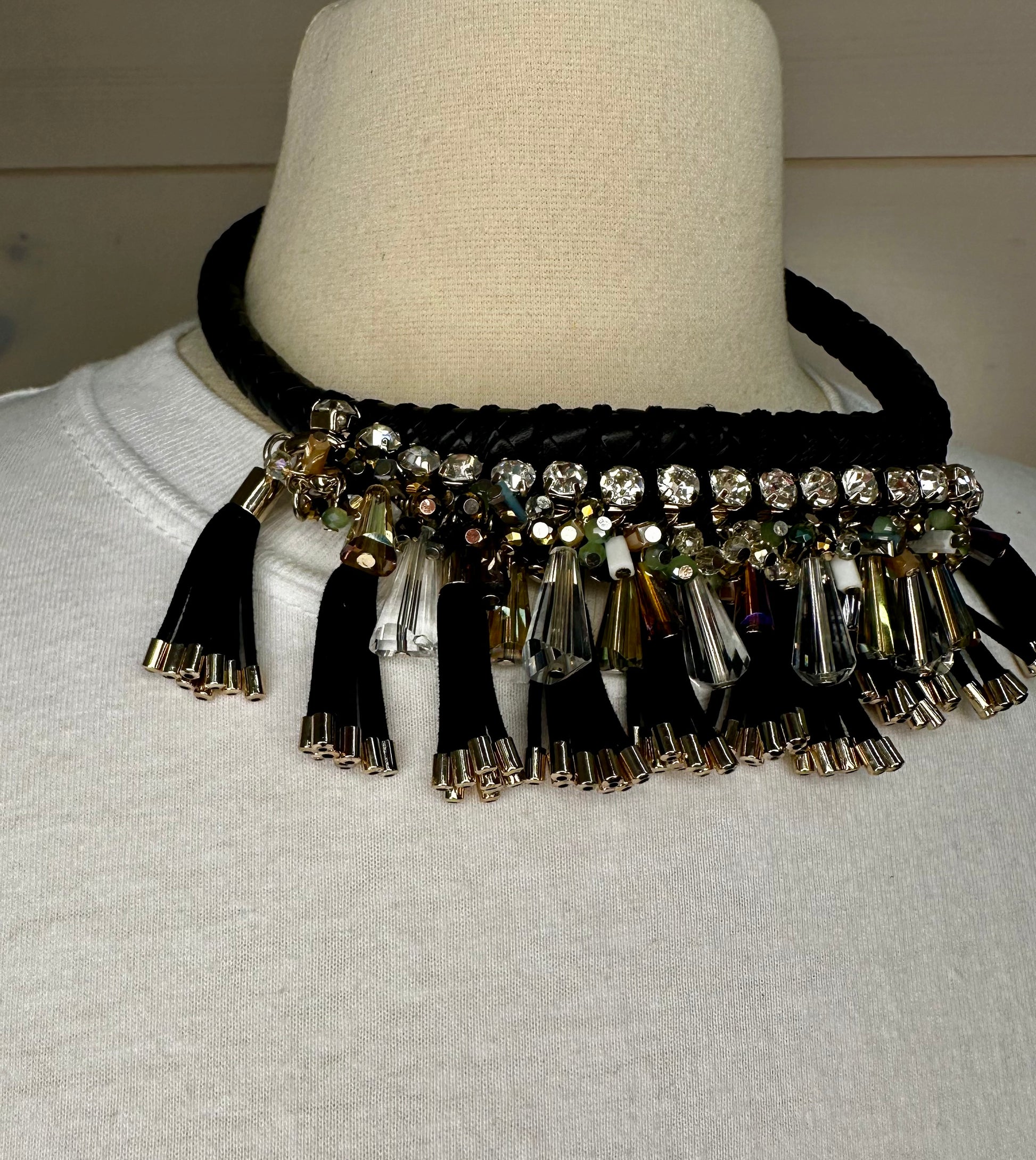 This is a real cutie. Itβs J.Crew brand leather with fringe and stones adjustable, braided leather necklace.