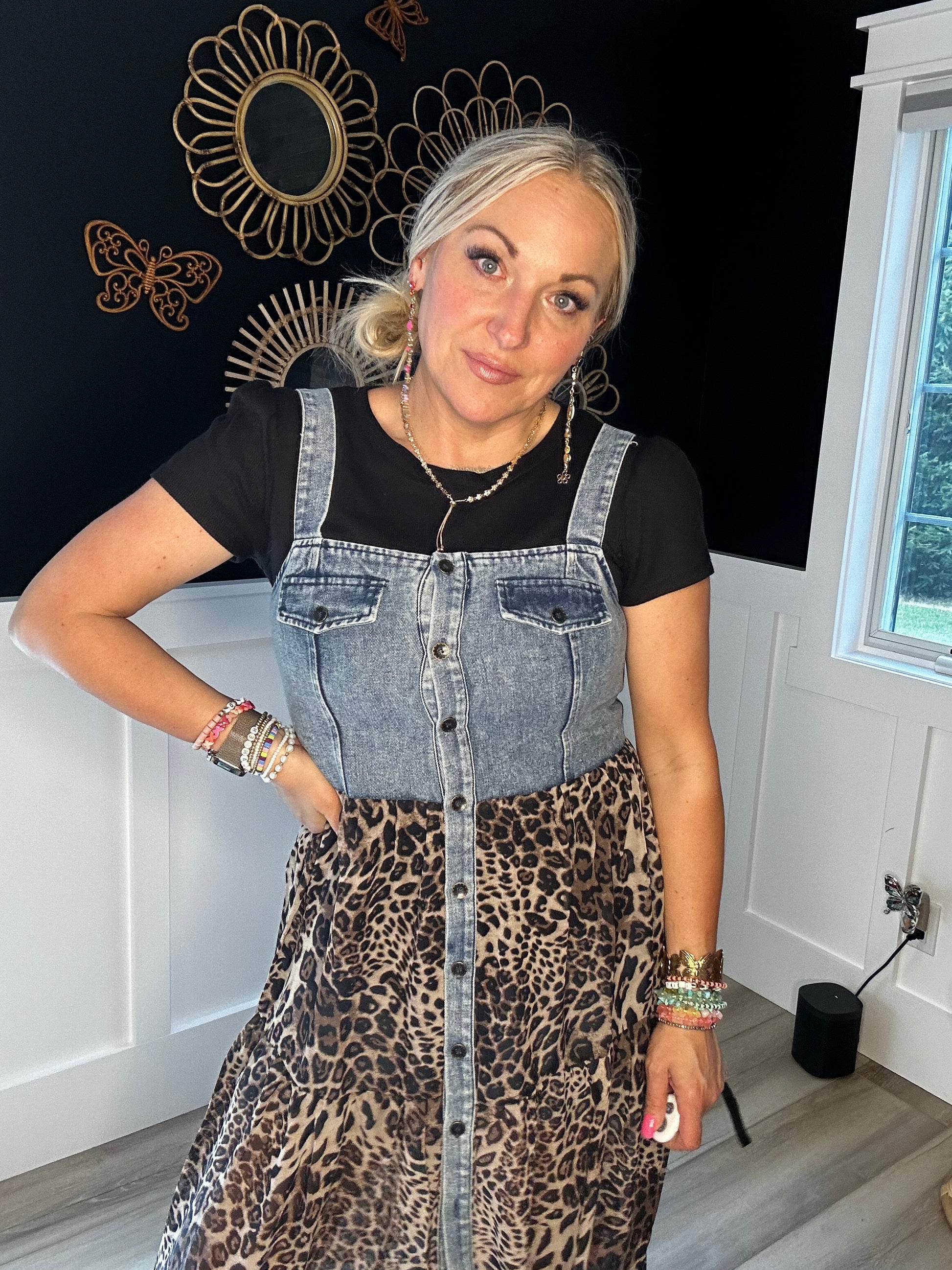 Leopard denim dress runs a little small. I’m wearing a size large in the picture but I do have a wider rib cage and I am a little busty bottom is Sheere could have leggings or biker shorts worn underneath can wear with or without a T-shirt even a little skirt would be cute underneath, all the buttons are functional