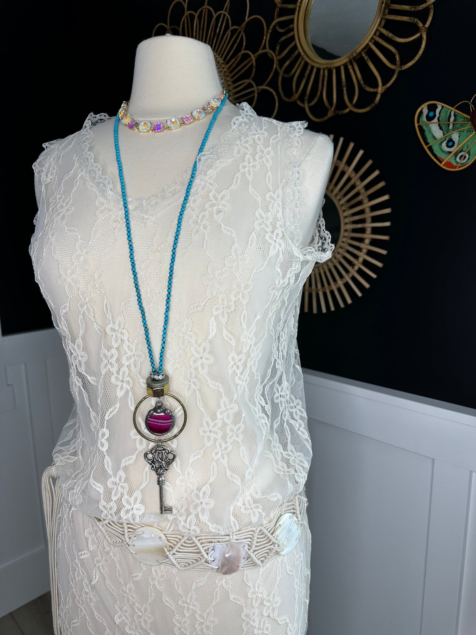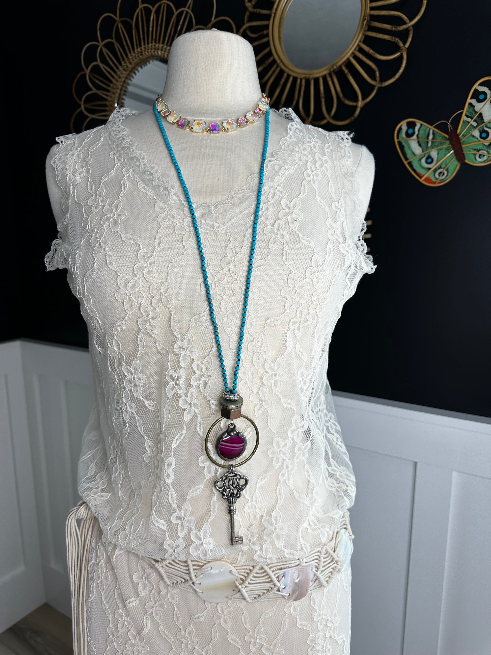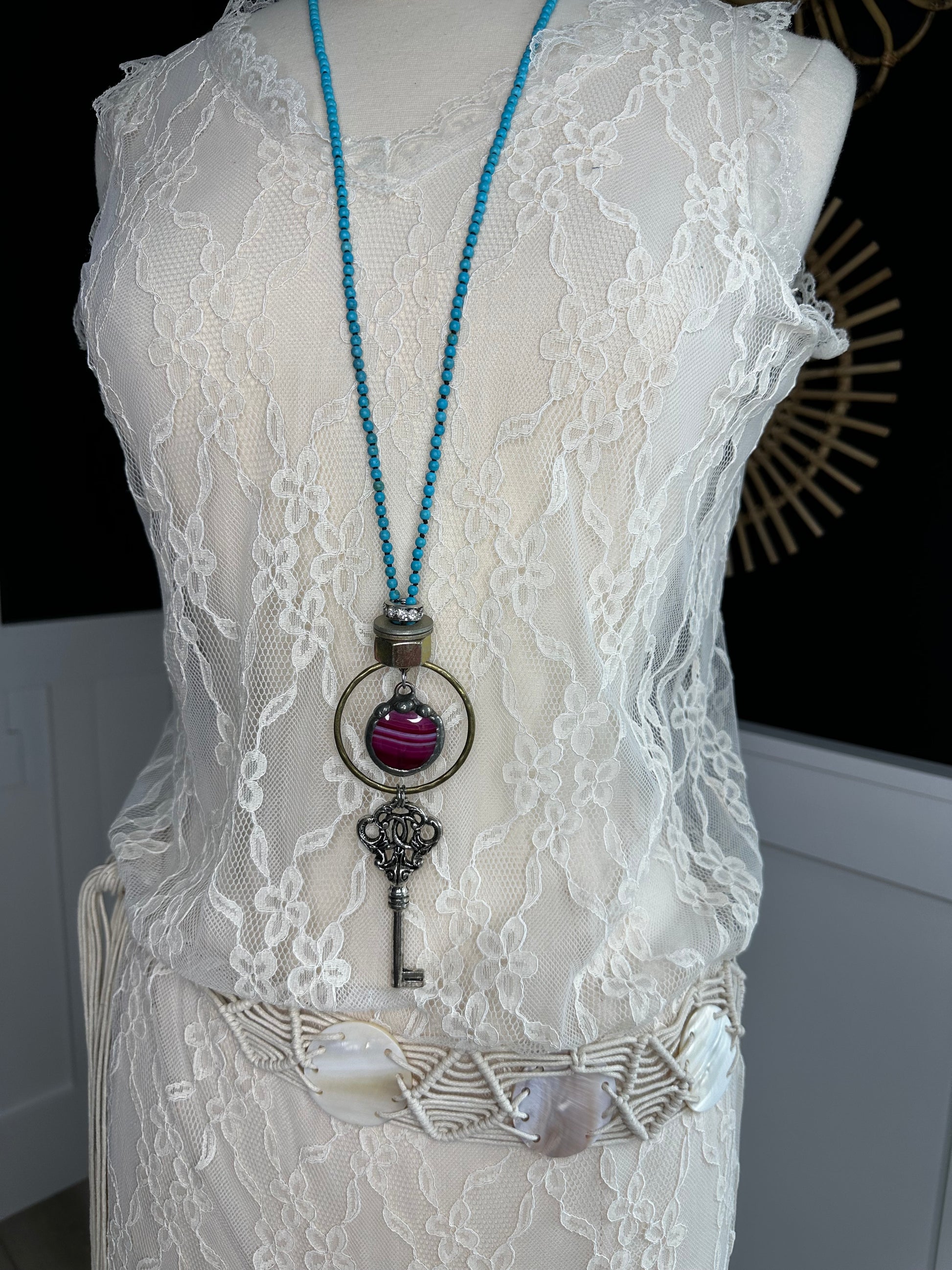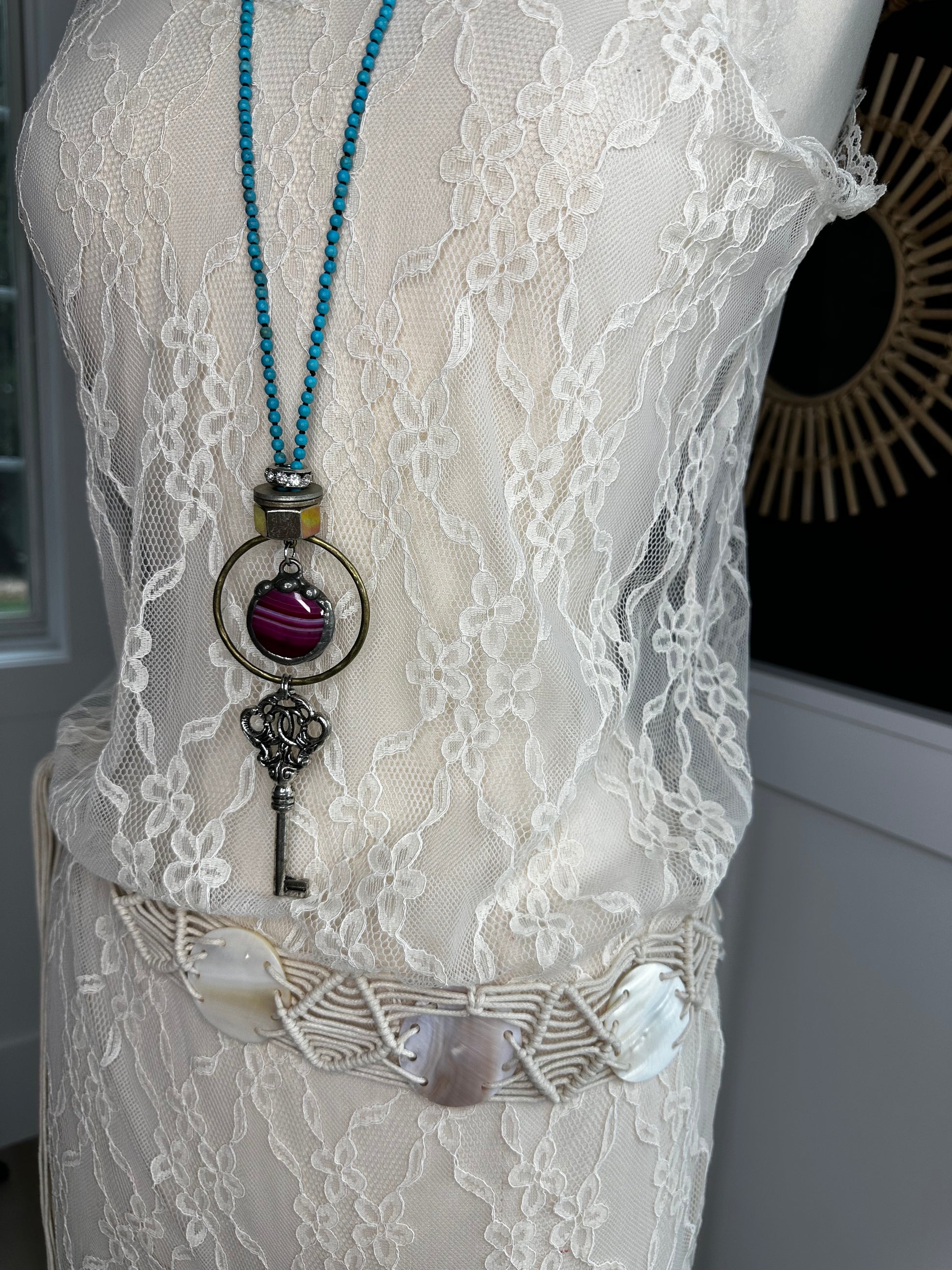 This necklace is such a cool combination of treasures, a skeleton key, some agate things that you would find in your workshop and a little extra sparkle make this turquoise beaded necklace such a treasure