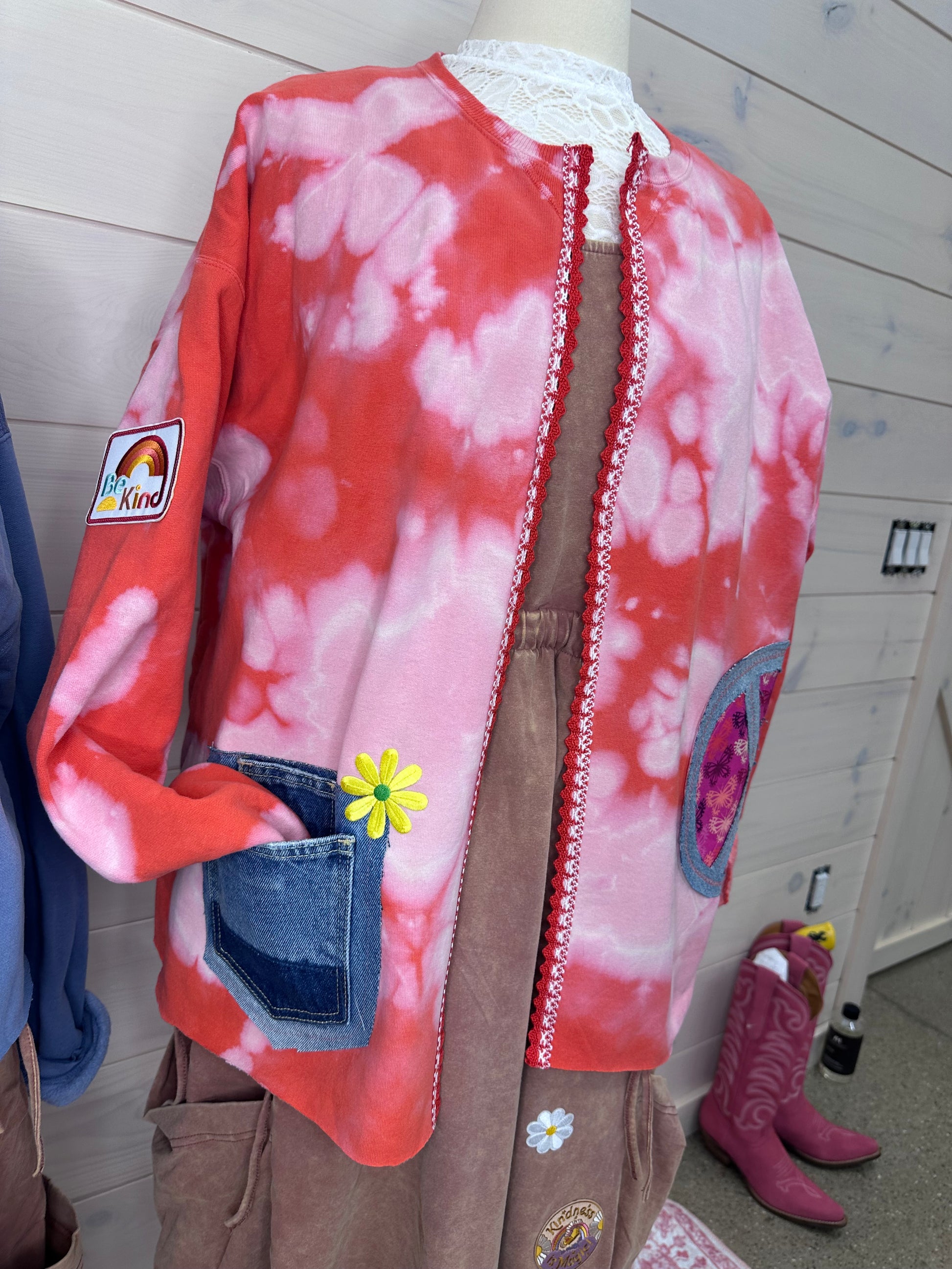This beautiful up cycle sweatshirt turned cardigan, has a vibe all its own, and one that the world so desperately needs right now it is a size large, but will fit multiple sizes almost free size because it is a cardigan
