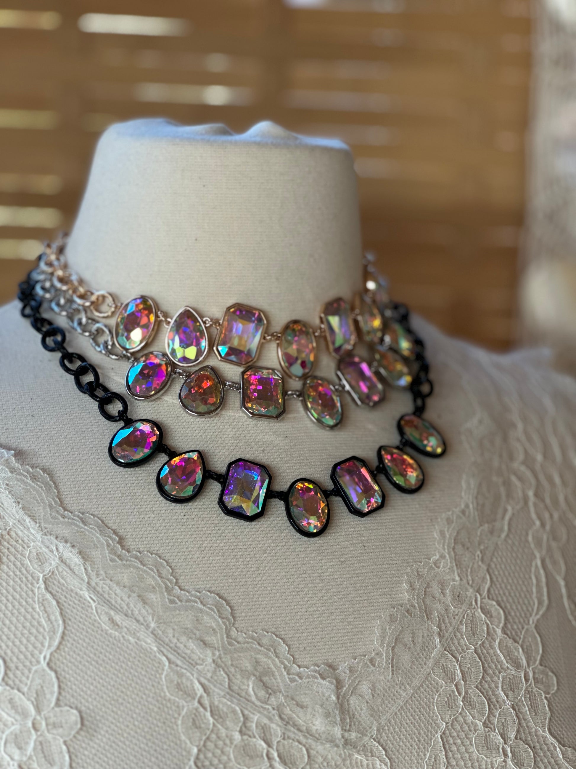 This one is a good one for stacking or even for a statement as a choker adjustable necklace comes in gold, black and silver. AB stones pop against every metal color.
