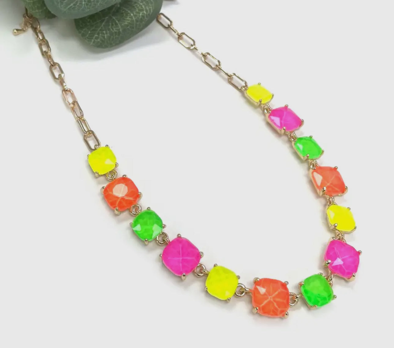 Neon Cushion Cut Glass Linked Chain Necklace:
