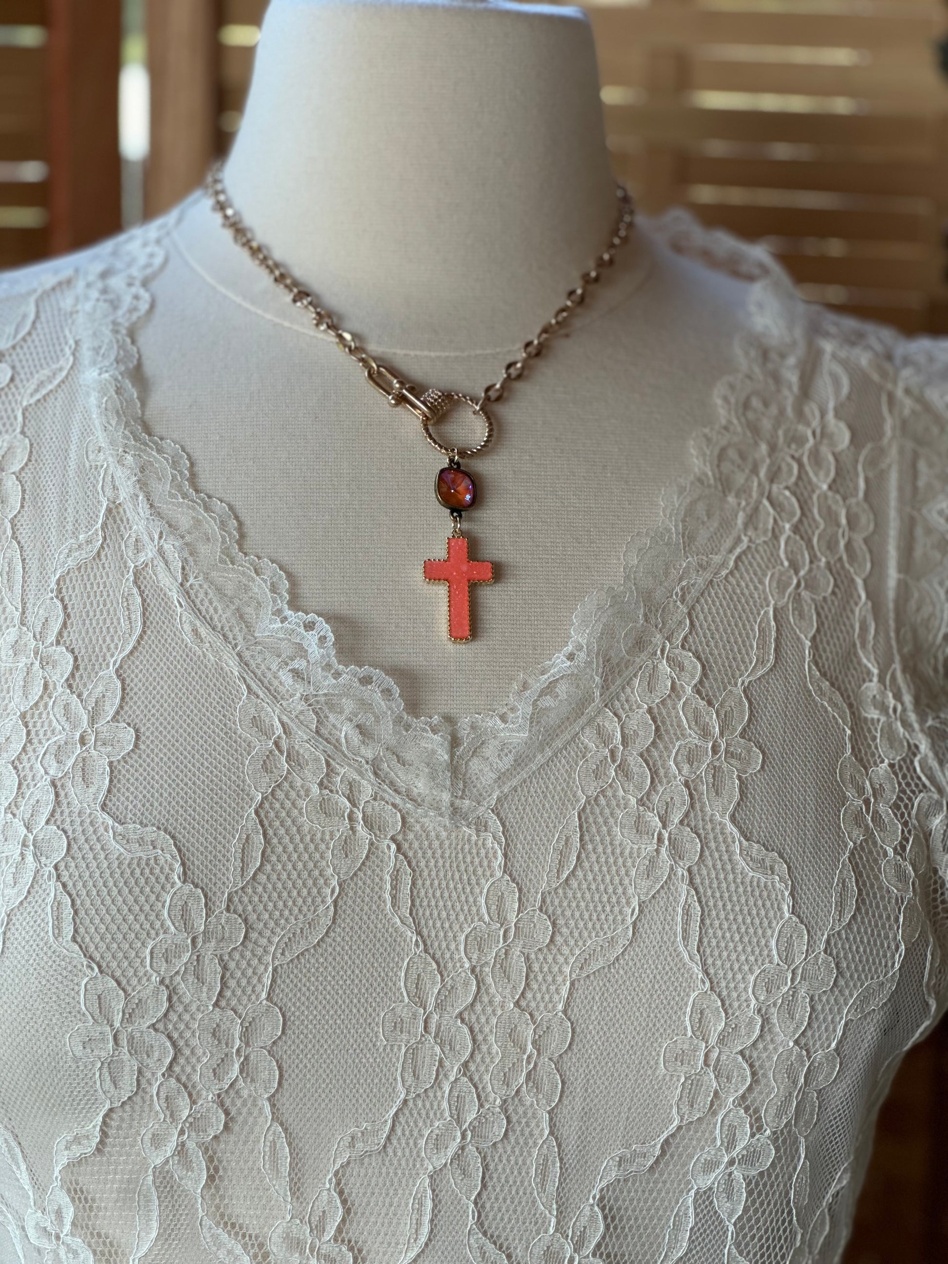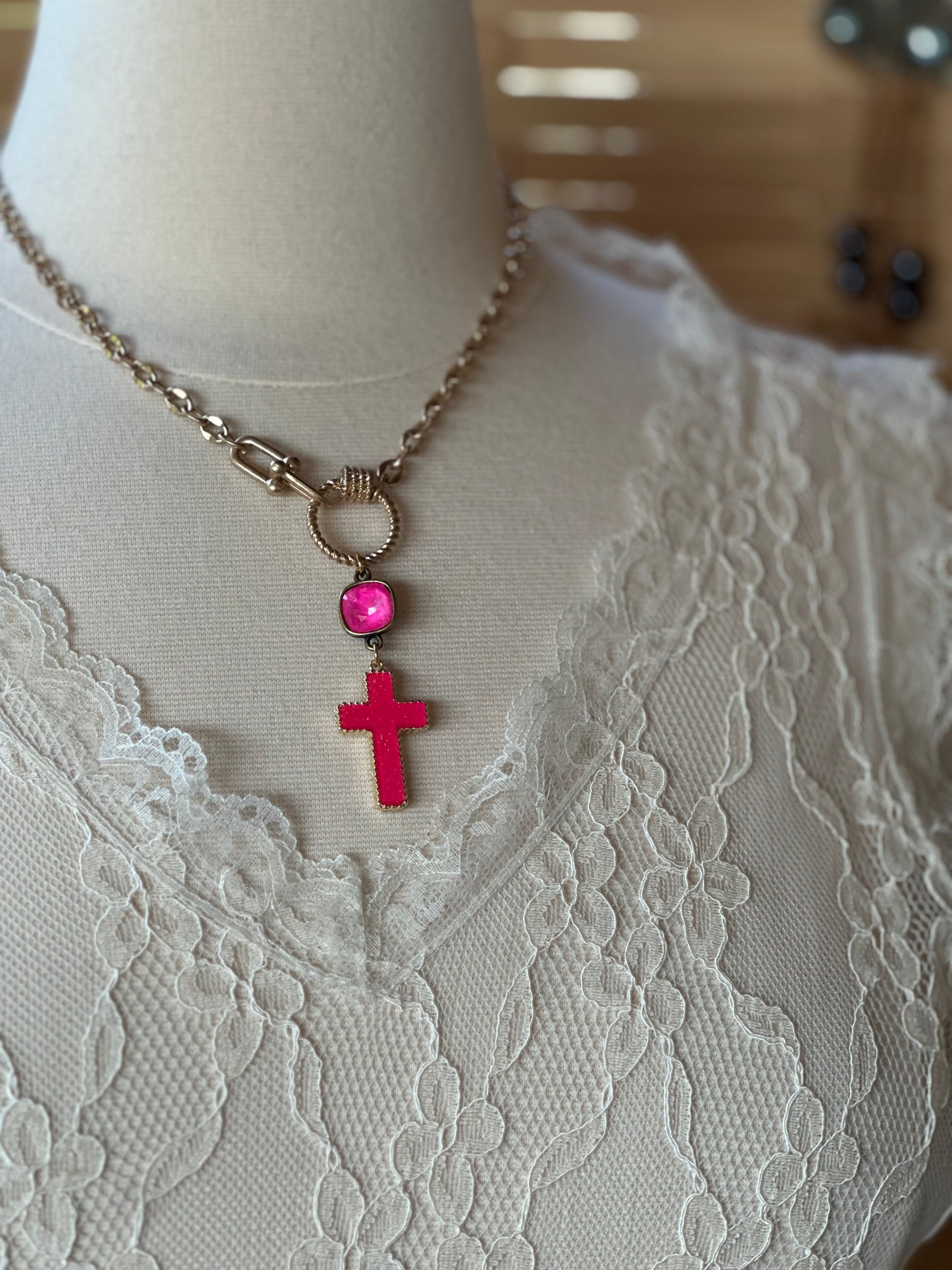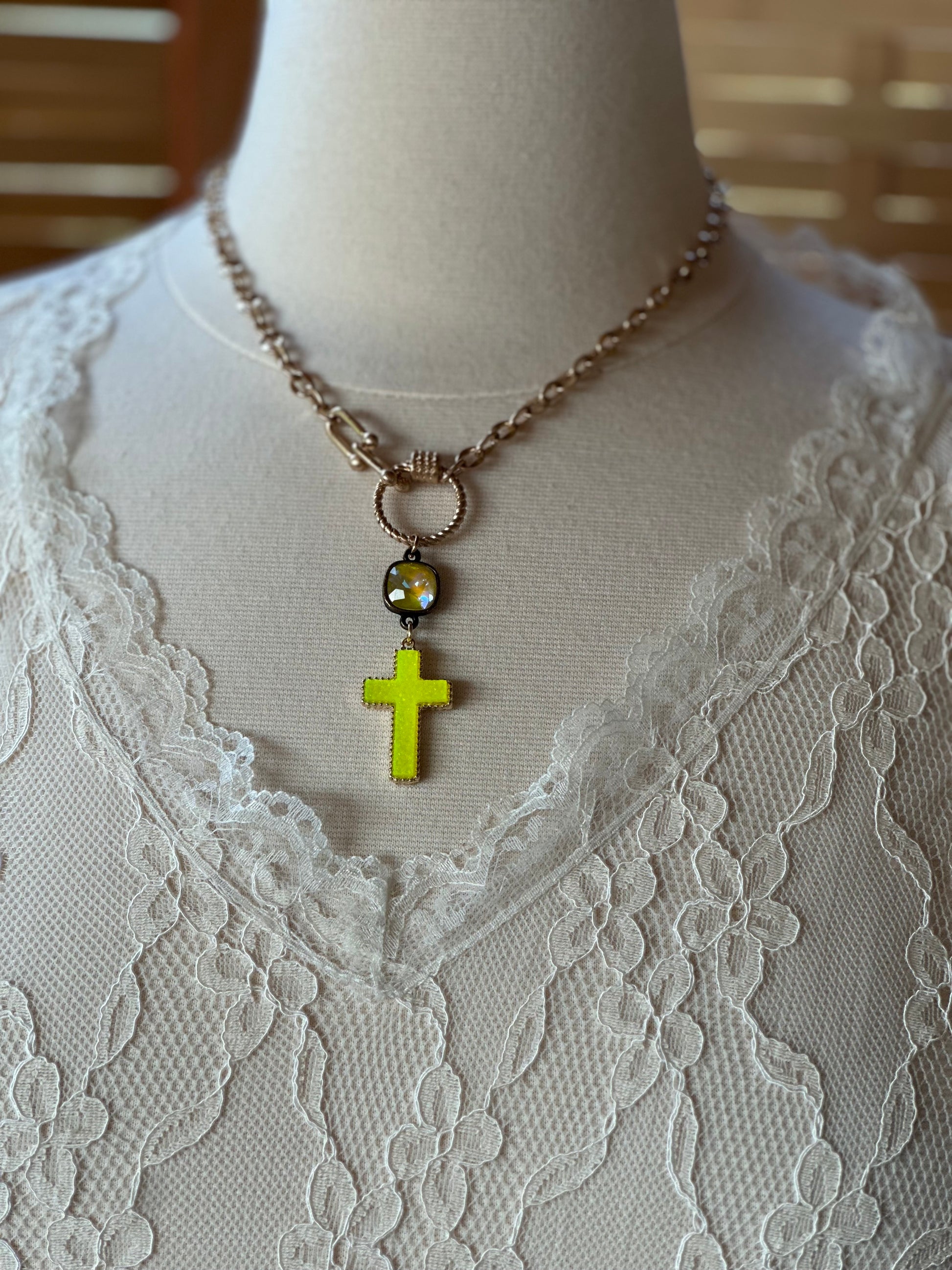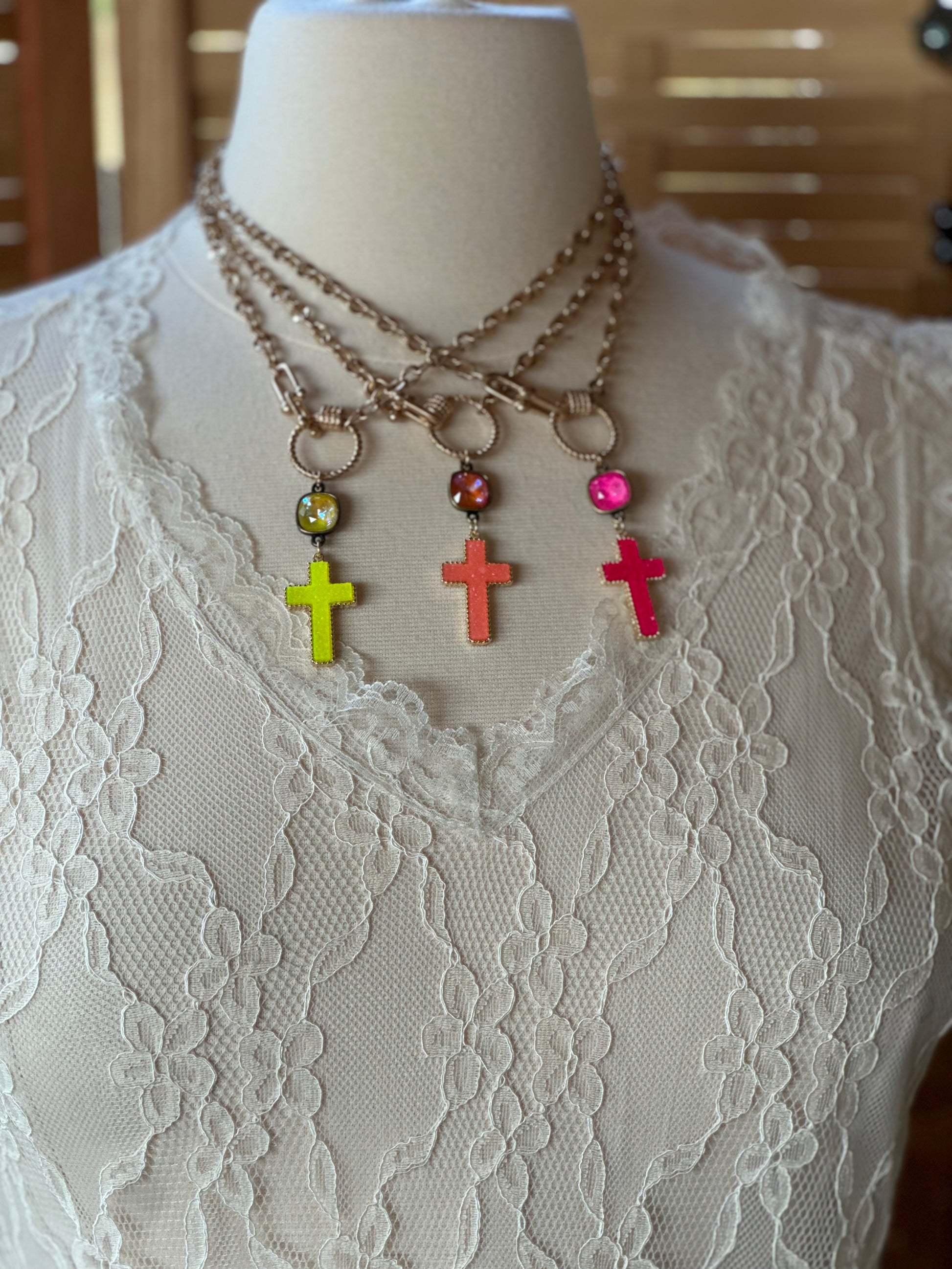 This is gorgeous cross rhinestone neon necklace makes a statement comes in three different color choices. Has the details on the chain for stacking or wearing singular also has matching earrings sold separately