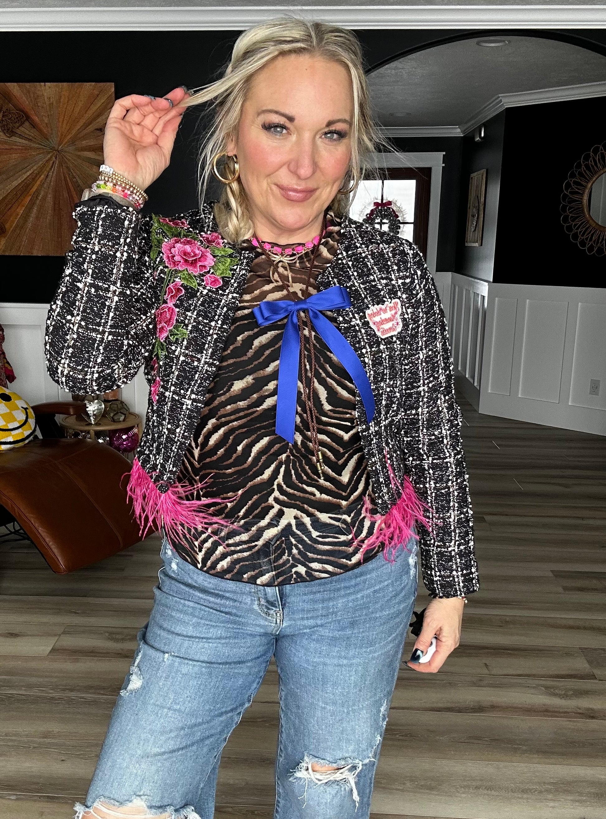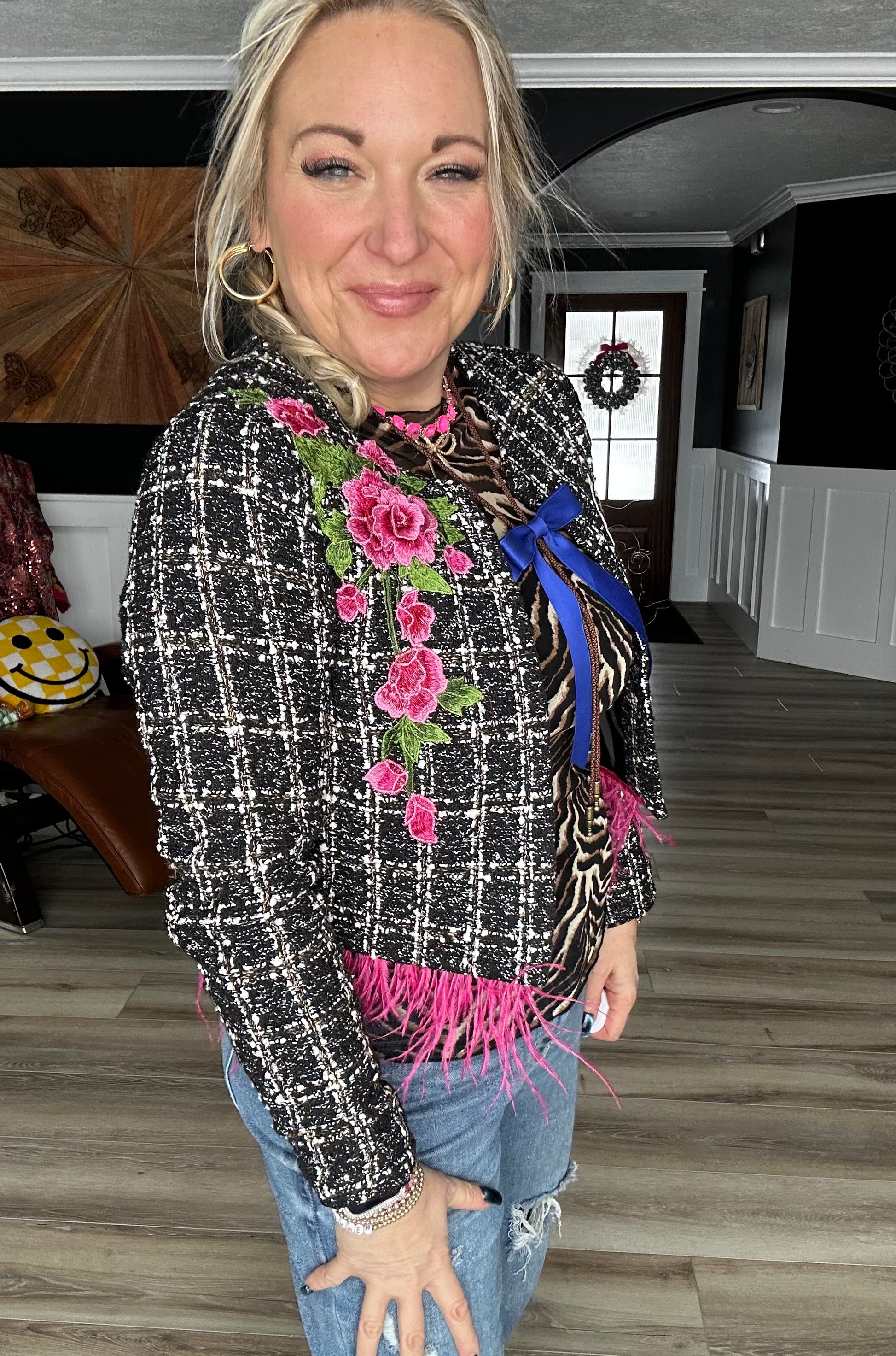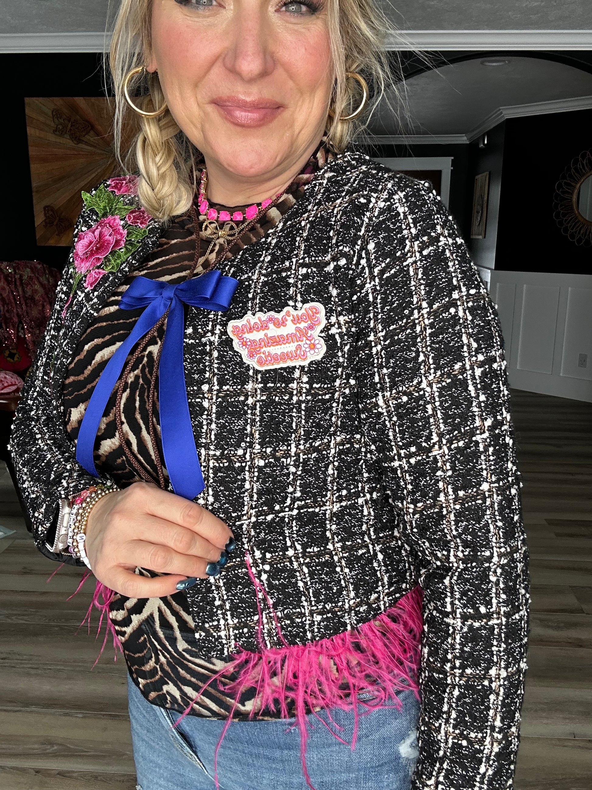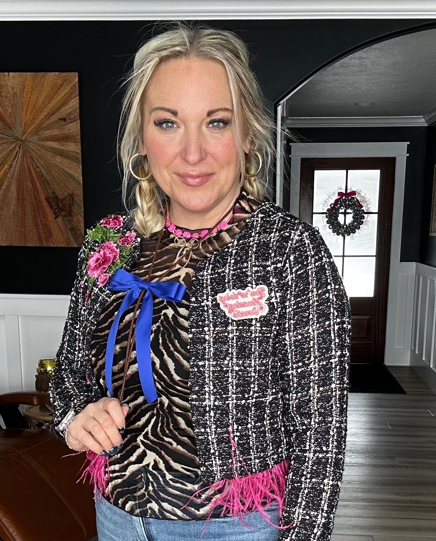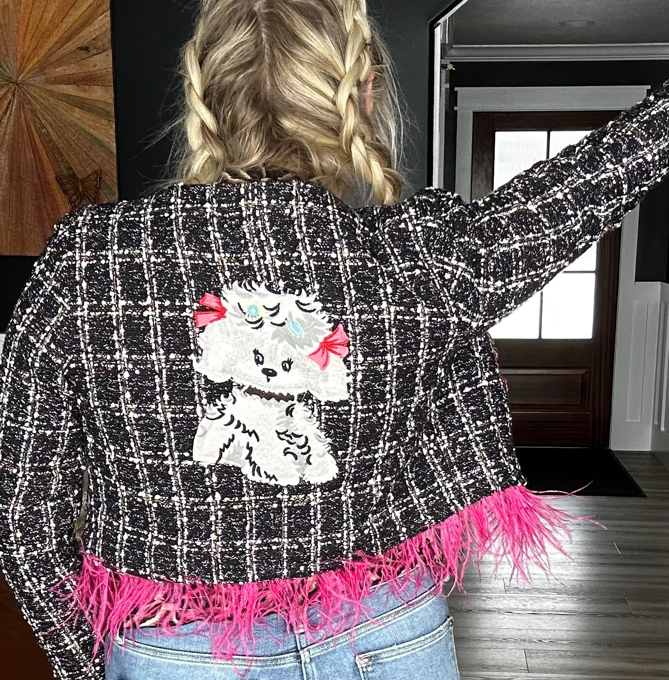 Oh, this one is stunning. This vintage inspired dog patch on the back is just the icing on the cake, detailed with bright pink feather trim, and the perfect Chanel style jacket.