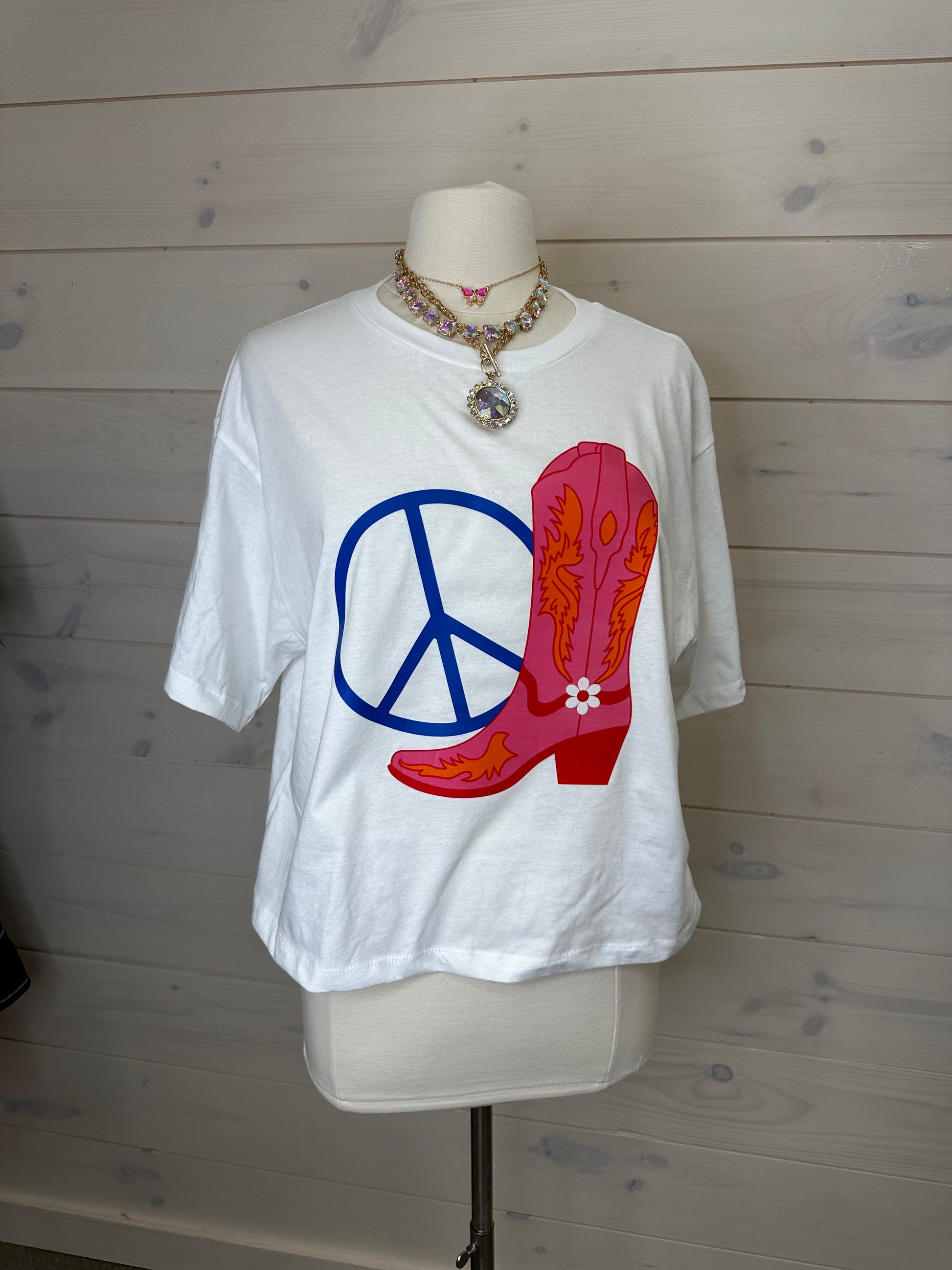 This graphic is one of my favorites. I’ve created peace and boots. The colors are so much fun and is a great color pop against the white T-shirt T-shirt is unisex a little cropped, but not short more like mid rise.