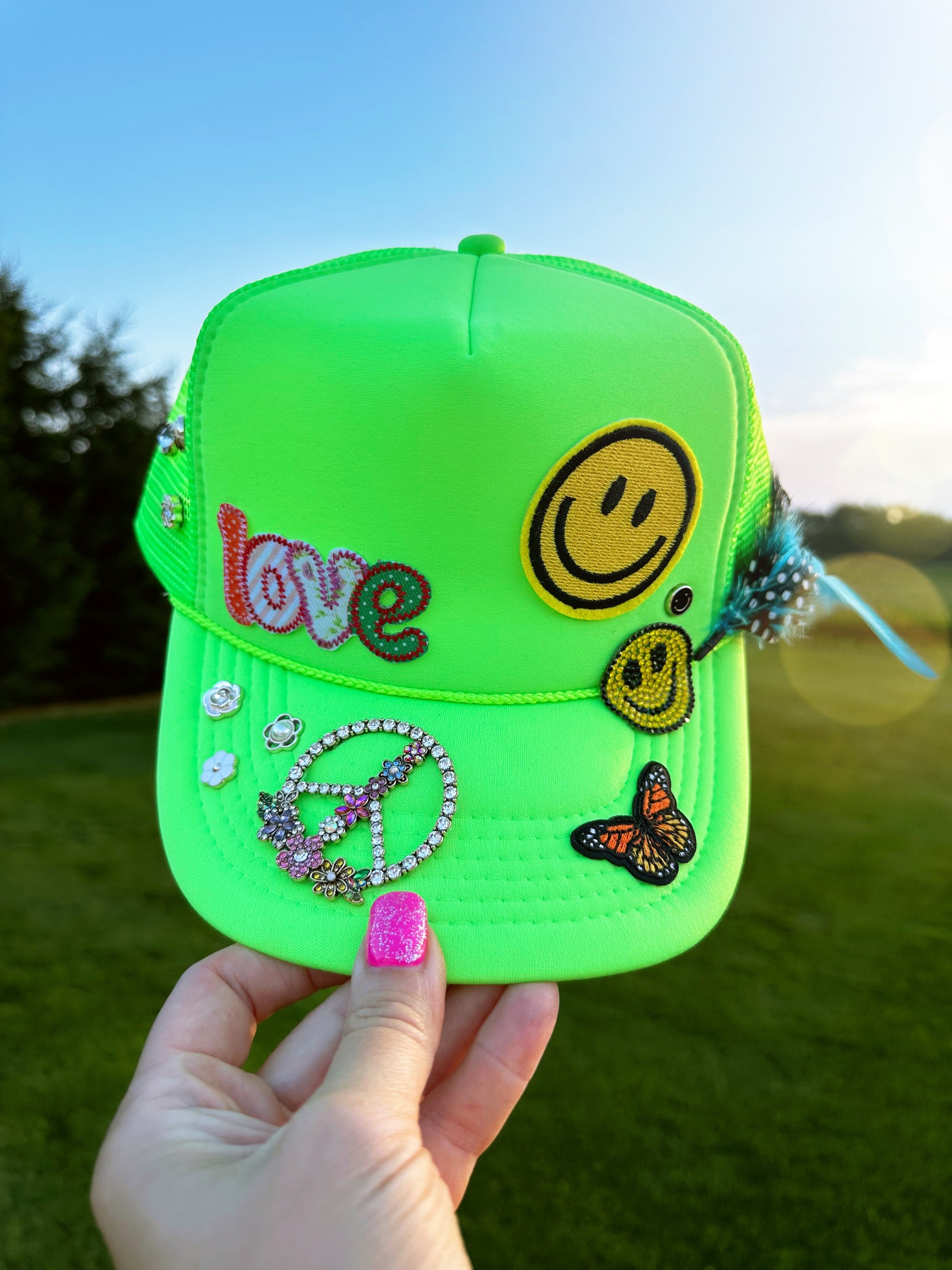 Neon Green Hat Makes this even cheerier statement piece. Lots of extra sparkle on this hat. So much fun I know it will make you(and others around you)happy when you put it on.