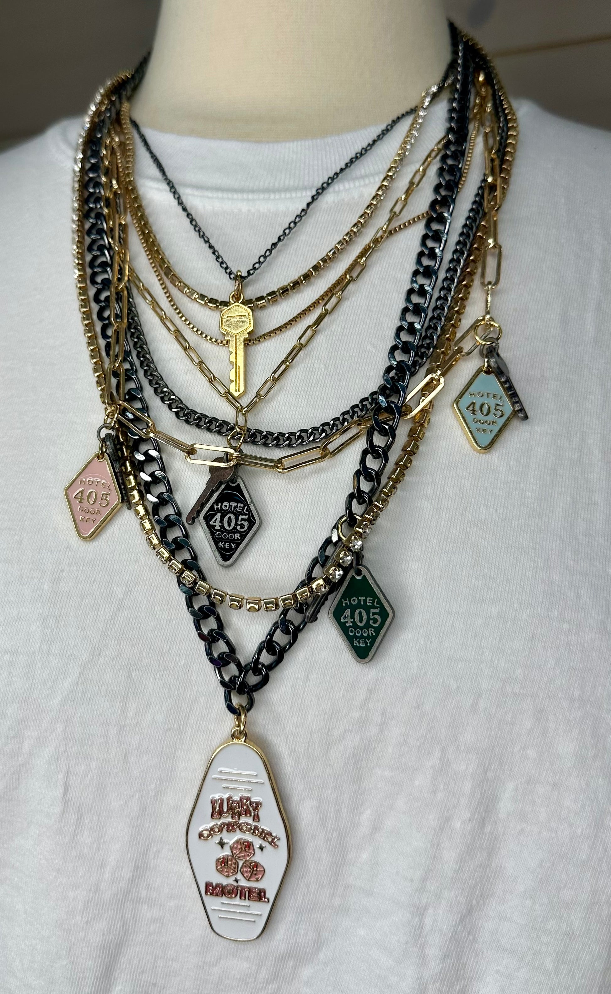 This multi stack necklace with one single closure is so much fun with all its hotel key theme one of a kind made by yours truly