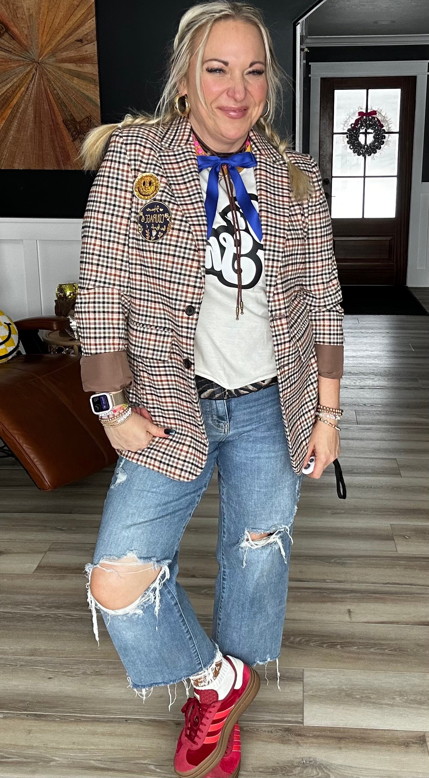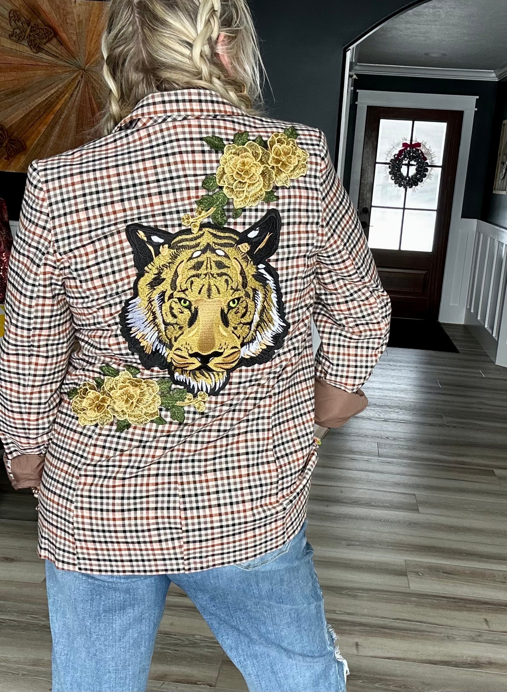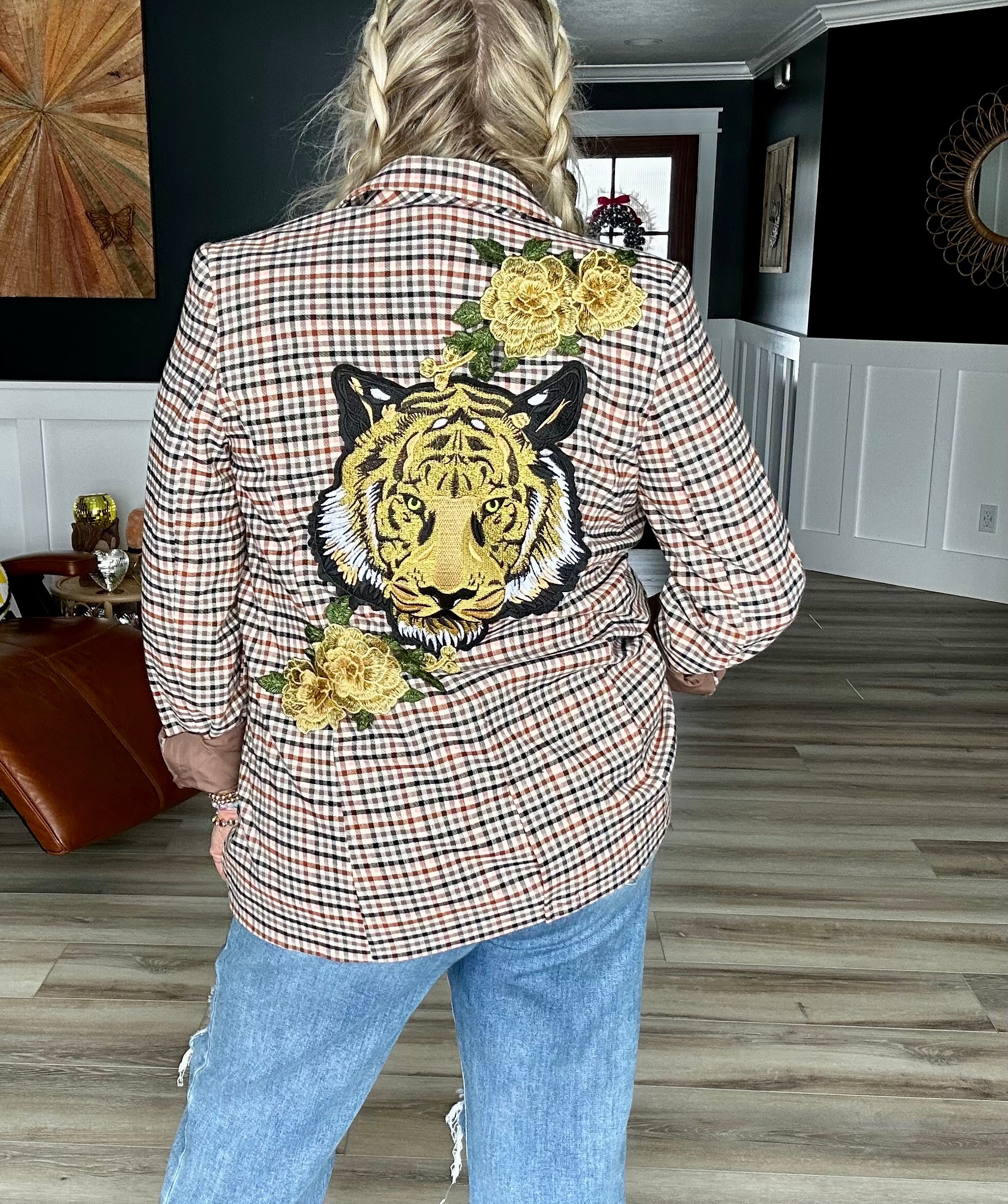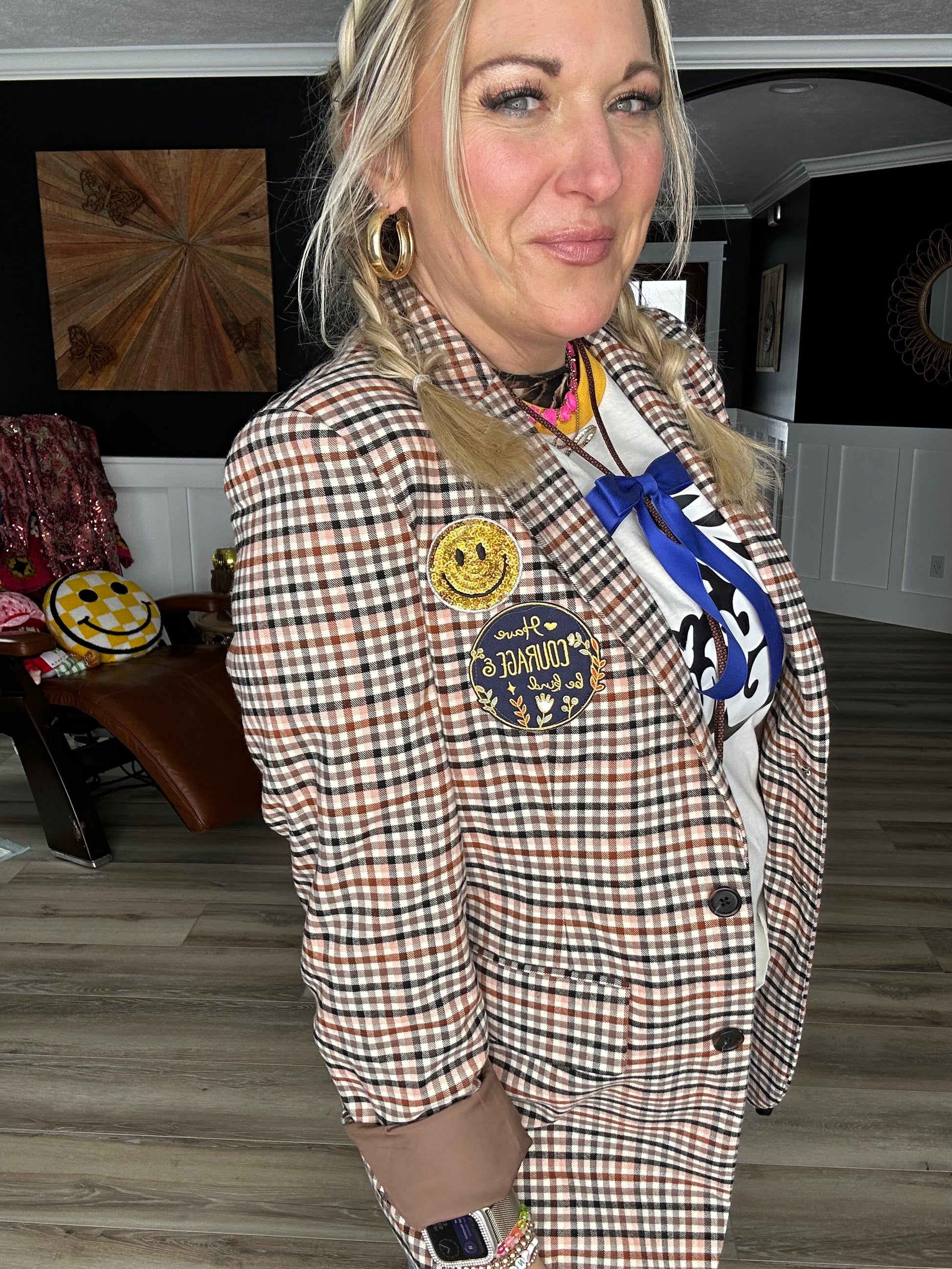 Oh, I love the back of this blazer so much. The whole collection of patches on this coat are so golden. There’s beautiful fitted women’s blazer is a stunning piece with these patches just telling a story all their own.  That is a size women’s medium