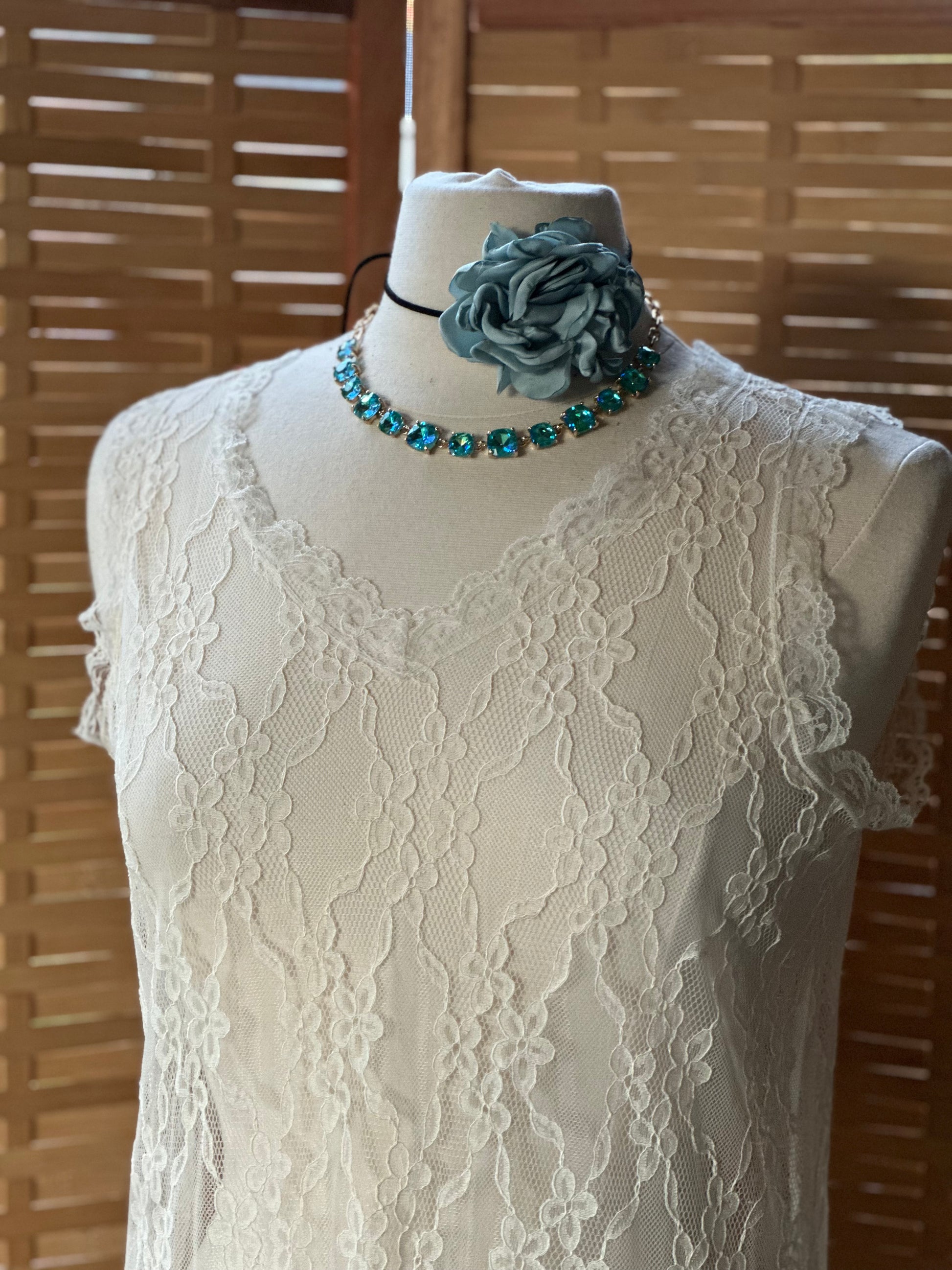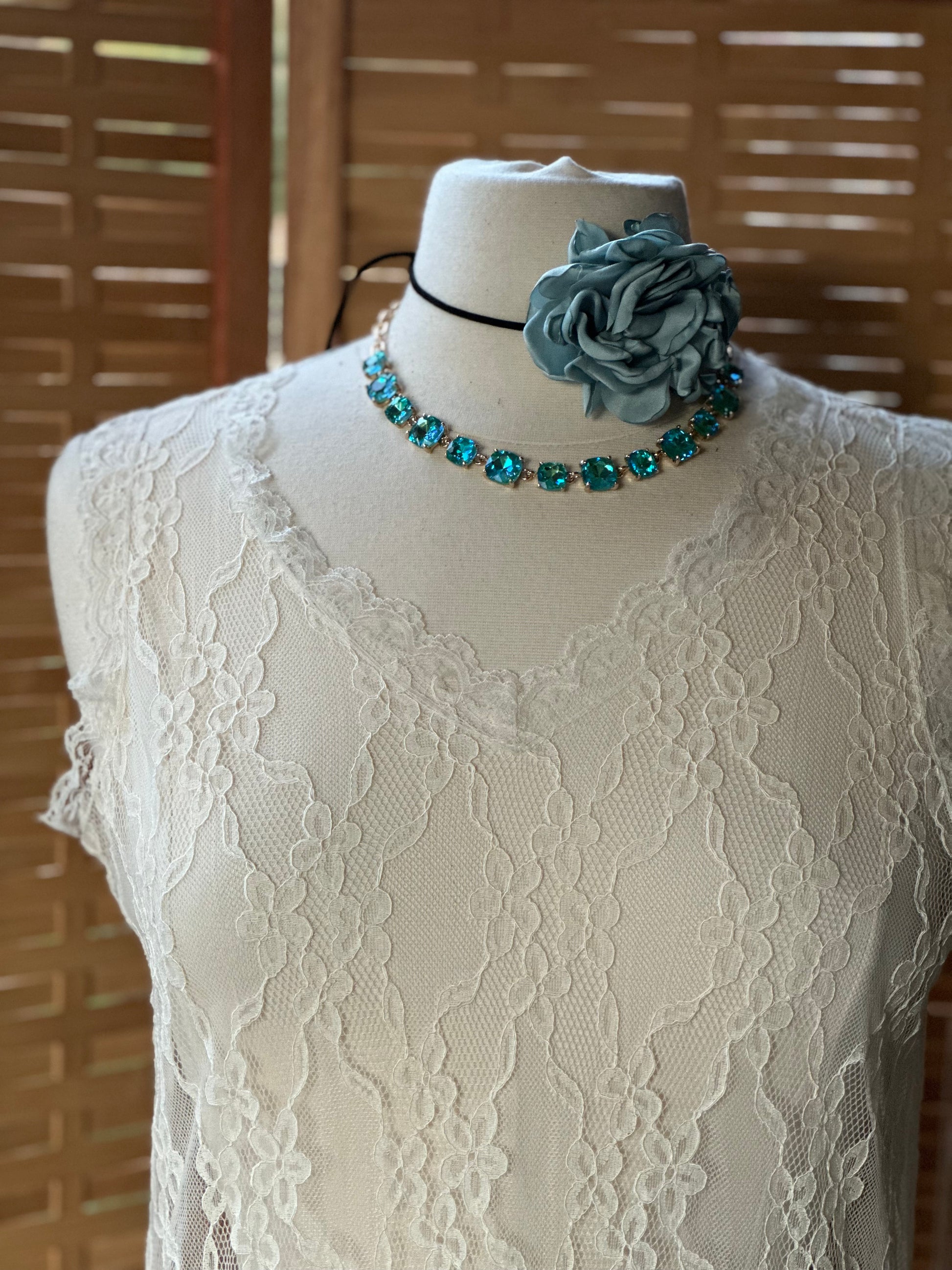 Beautiful, lightweight satin like Teal rose on a black leather cord is a perfect lightweight accessory to add to any necklace stack