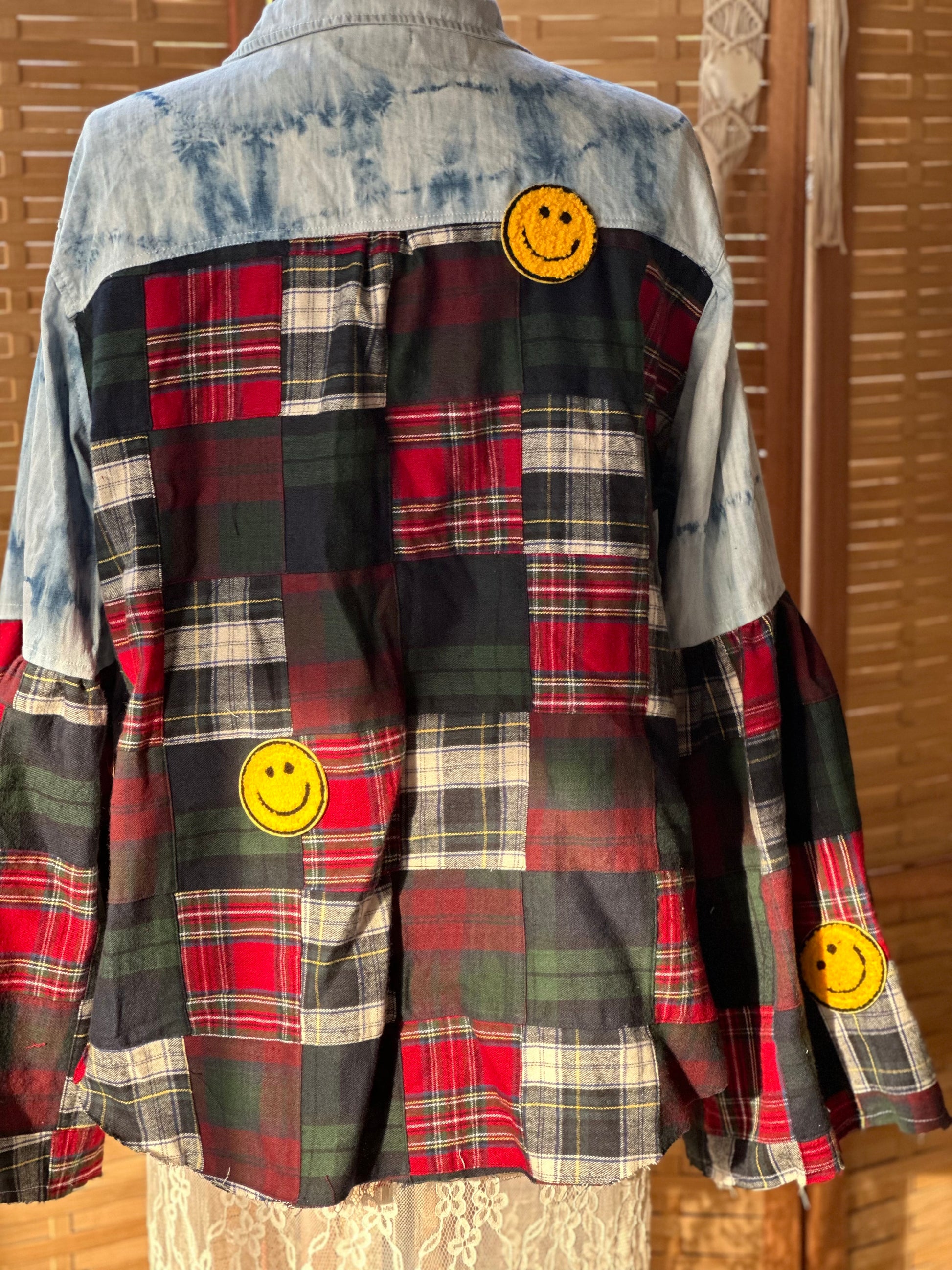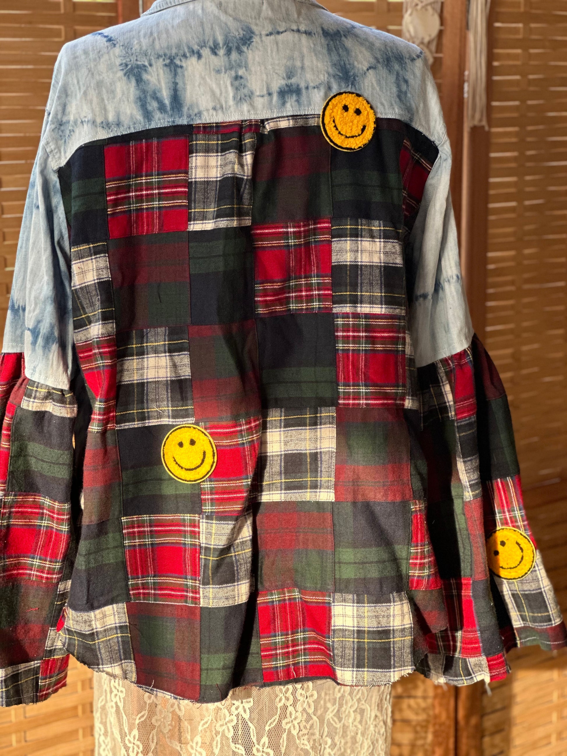 Tie-dye denim and flannel :-) patch shirt is so cute and already Men’s size extra large