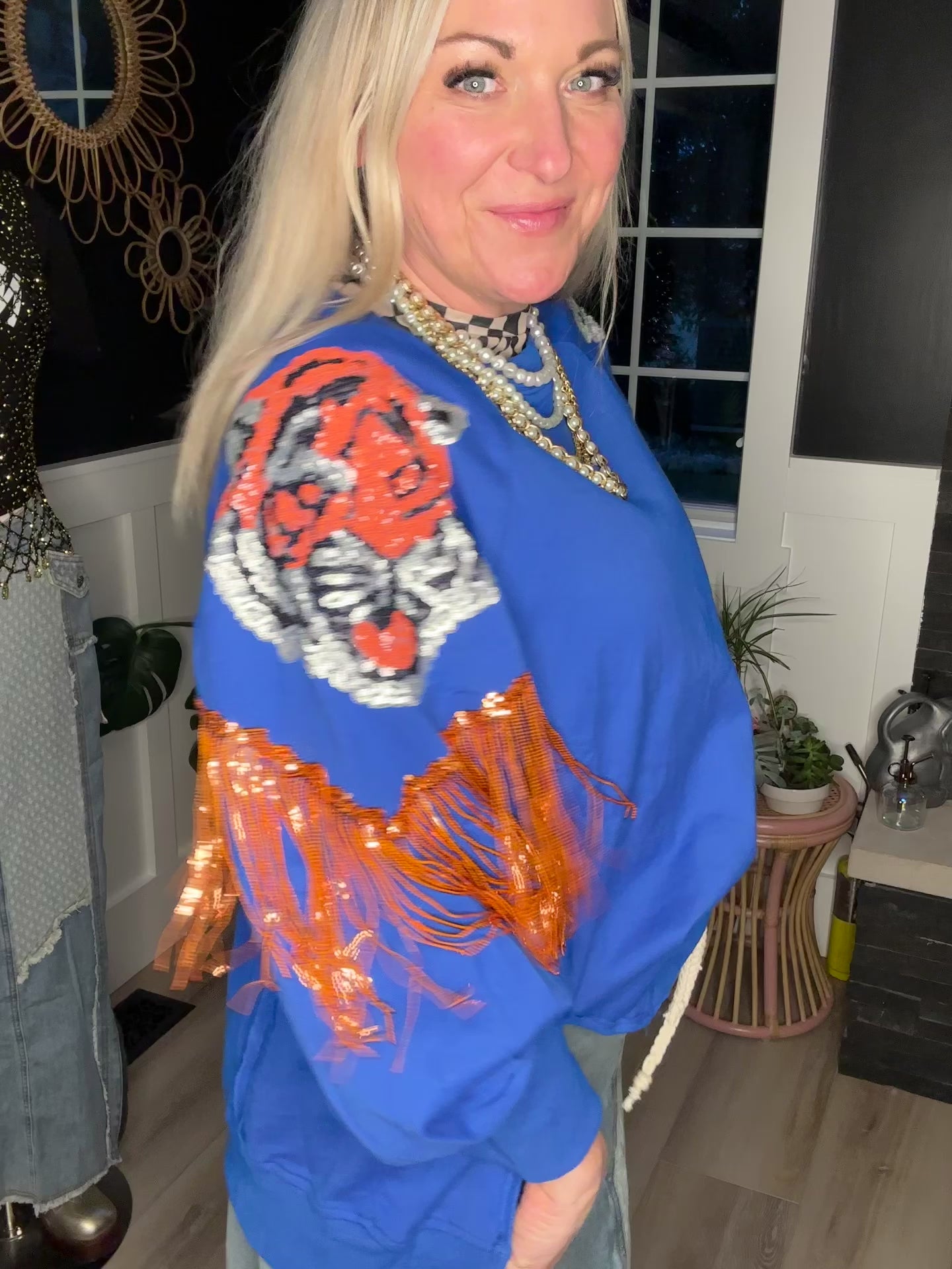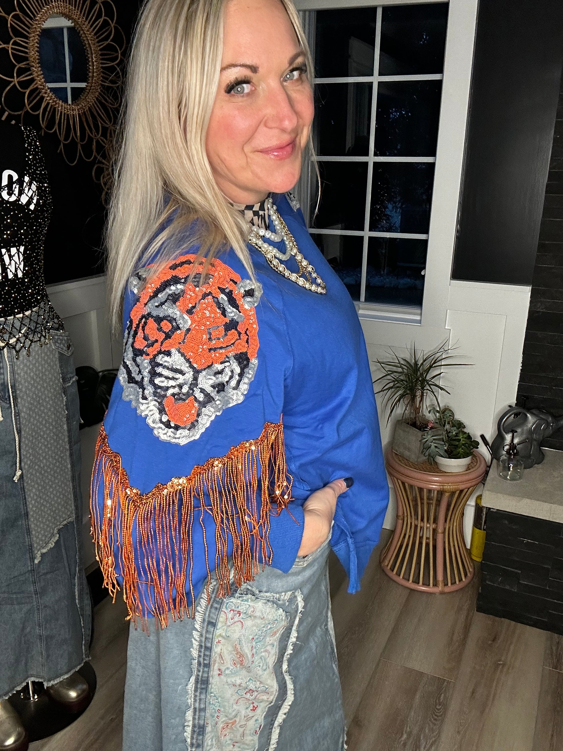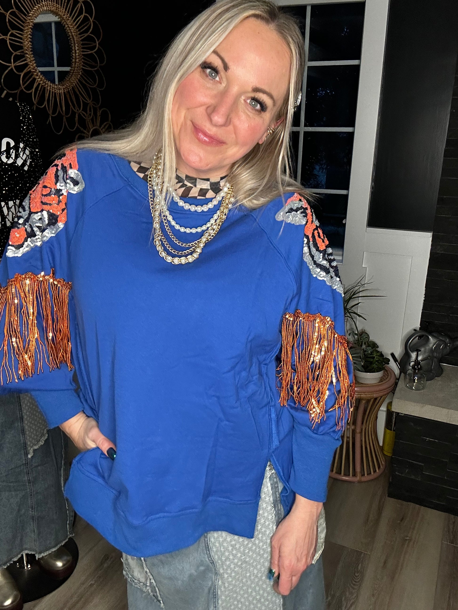 Royal blue French, Terry , tiger, sequin fringe absolute goodness comes in three sizes a small, medium and large very roomy perfect weight not too hot and the colors pop