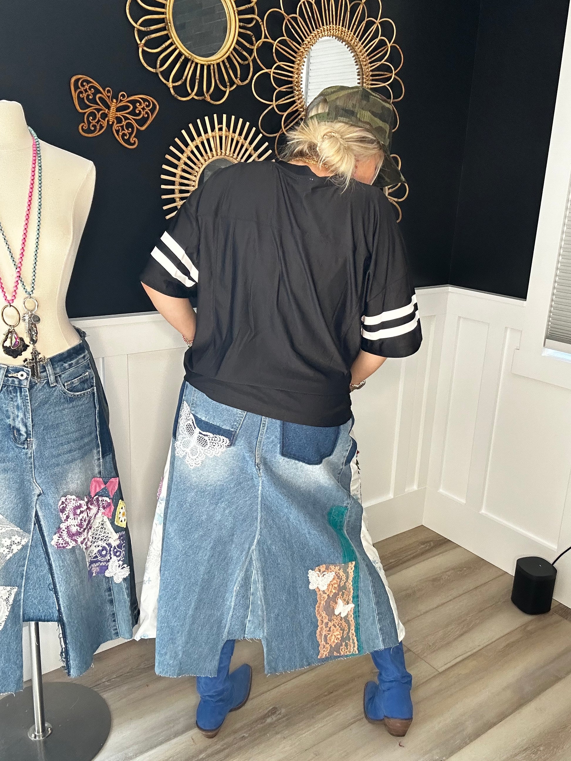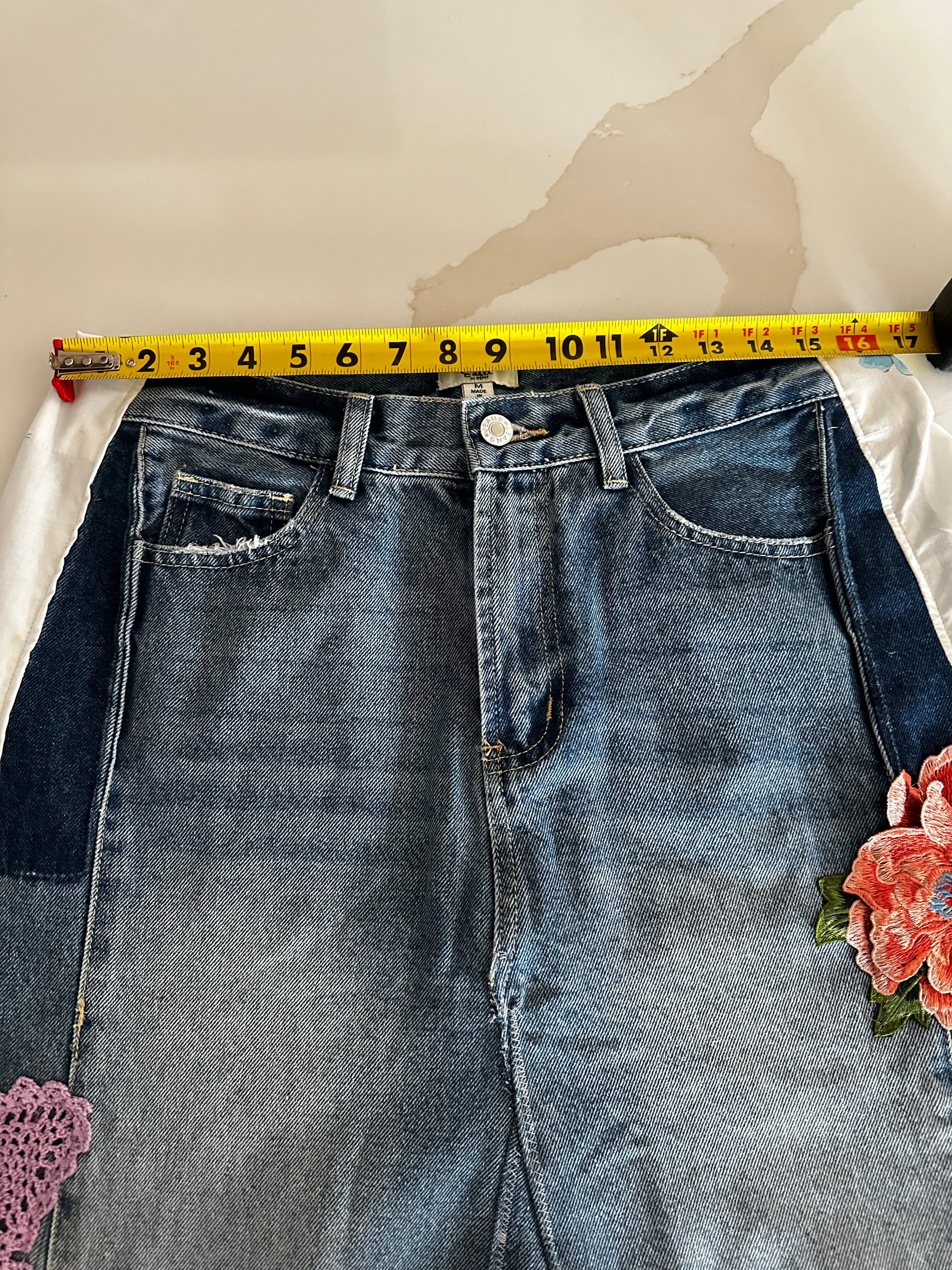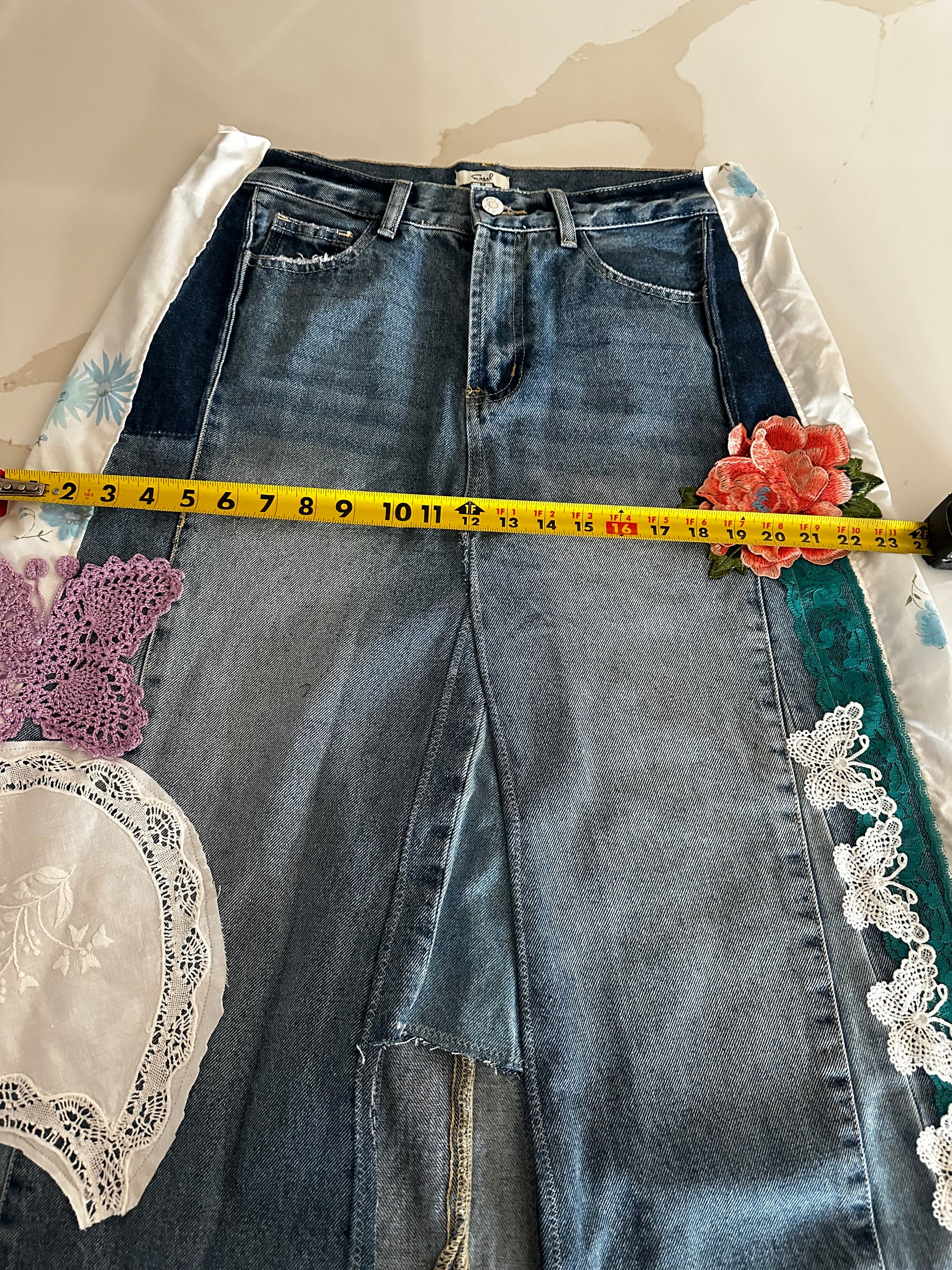 Up cycled awesome jeans with all the details that make them magically transformed to one of a kind skirt that tells a story all of its own. Measurements included in photo is baggy on my size 8 frame that could be worn, loose or fitted