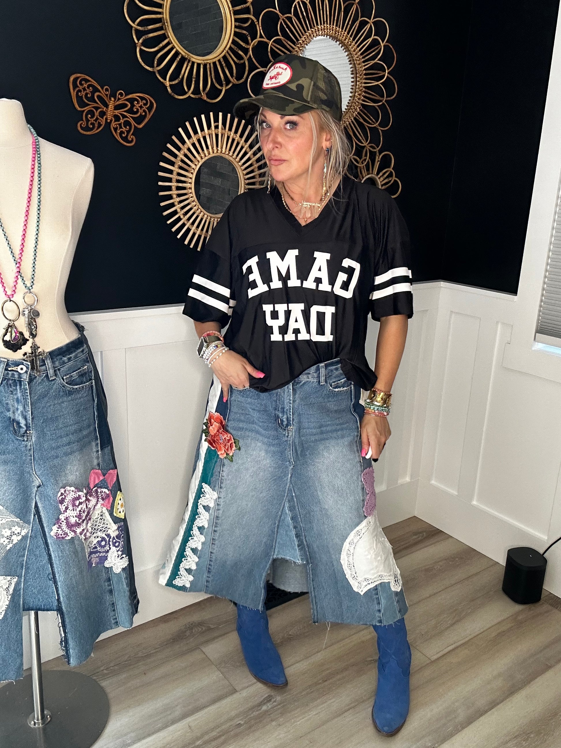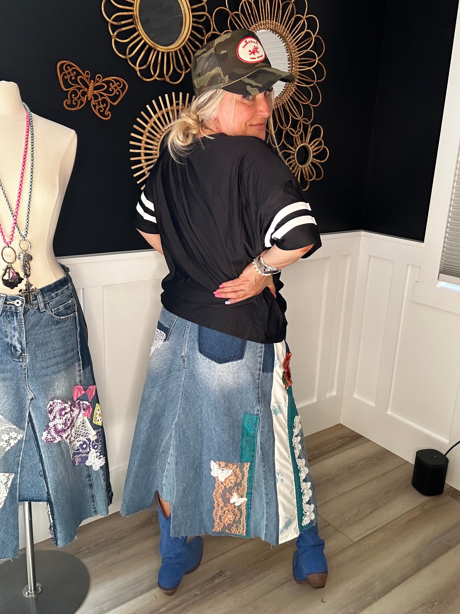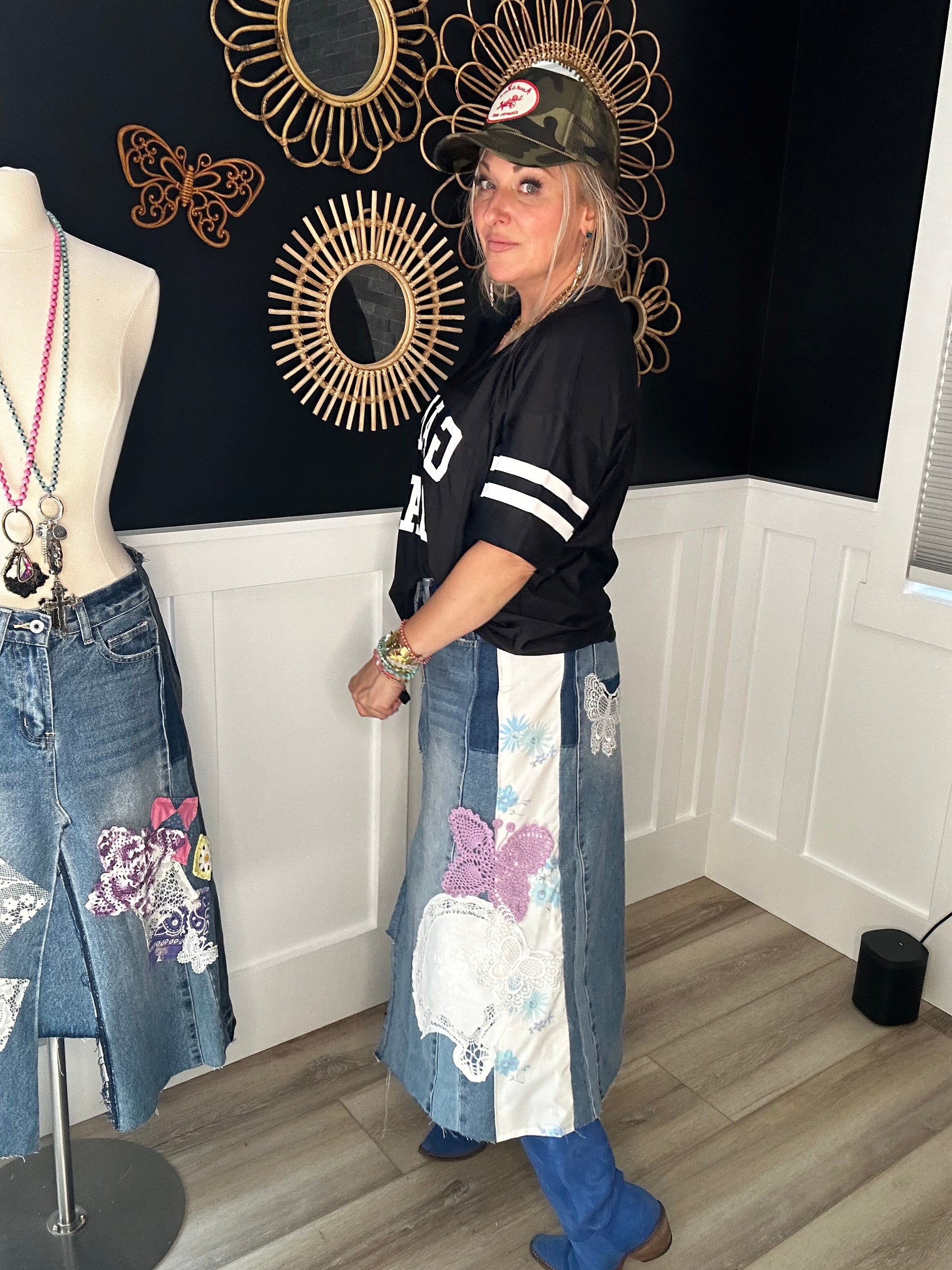 Up cycled awesome jeans with all the details that make them magically transformed to one of a kind skirt that tells a story all of its own. Measurements included in photo is baggy on my size 8 frame that could be worn, loose or fitted